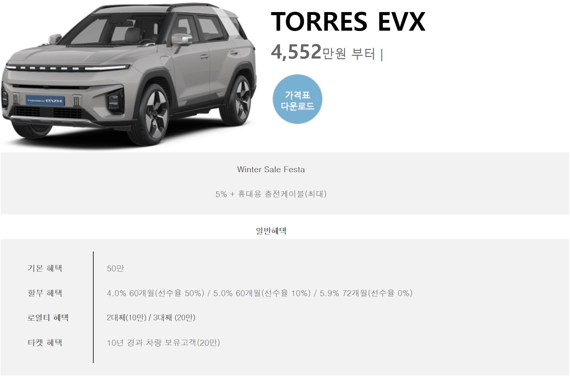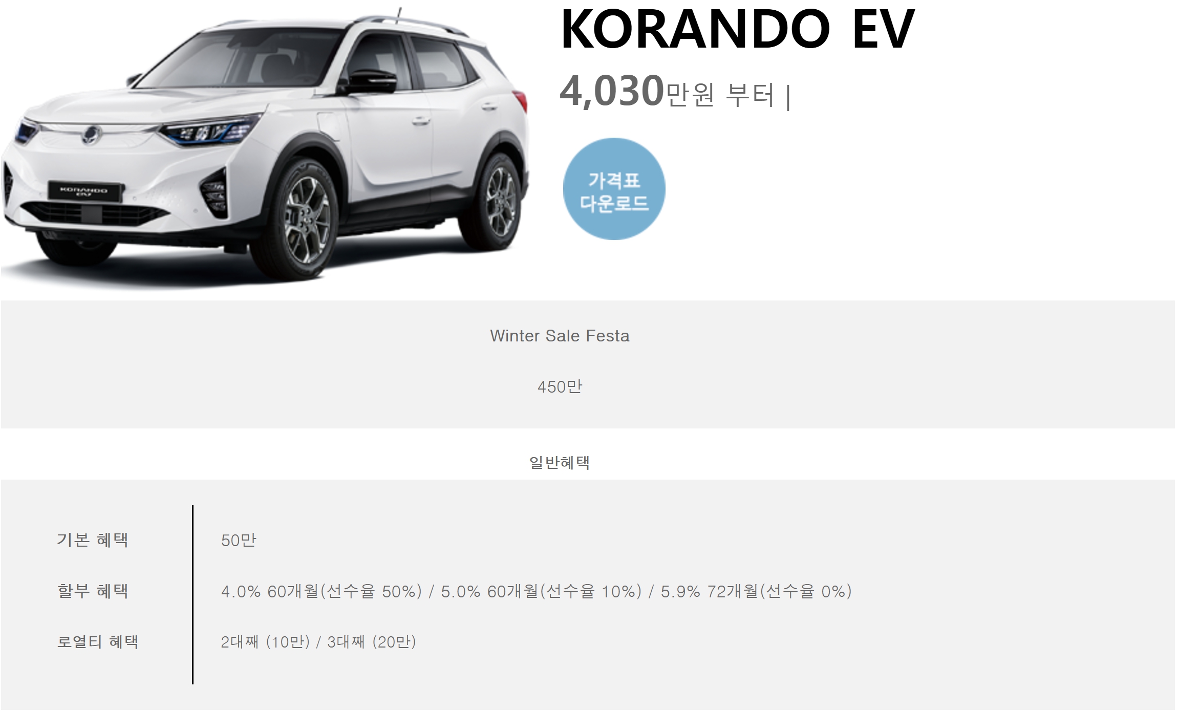 할인이 꽤 좋긴 하지만, 현시점에서 토레스 EVX가 아닌 코란도 EV를 찾으시는 분들이 몇 분이나 계실지...