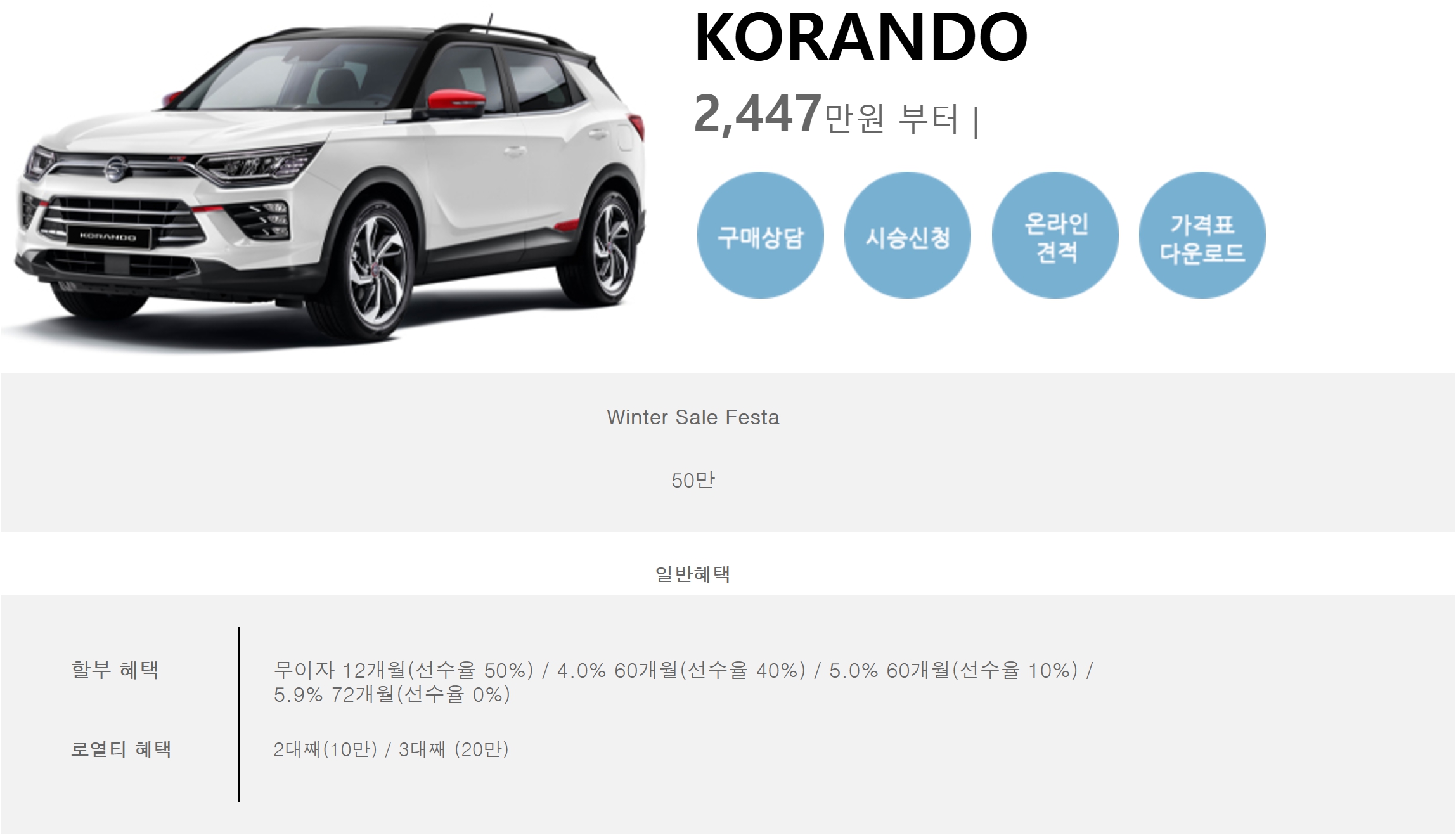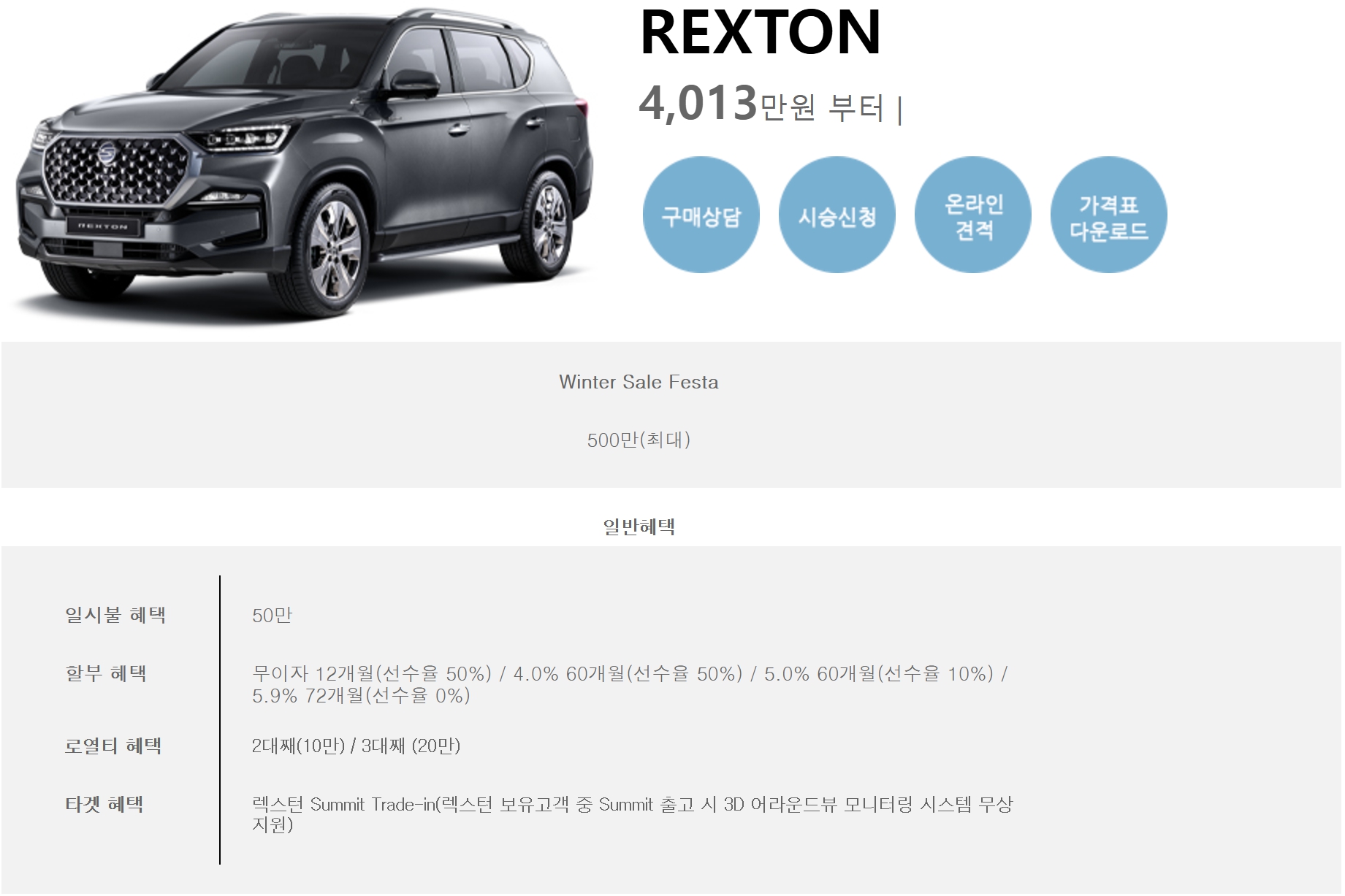 그나마 렉스턴이 페스타 할인이 조금 되는 편인데, 페스타 할인은 특성상 특정 재고에 대한 할인이기 때문에, 모두에게 적용되는 기본 혜택과는 조금 다른 편입니다.