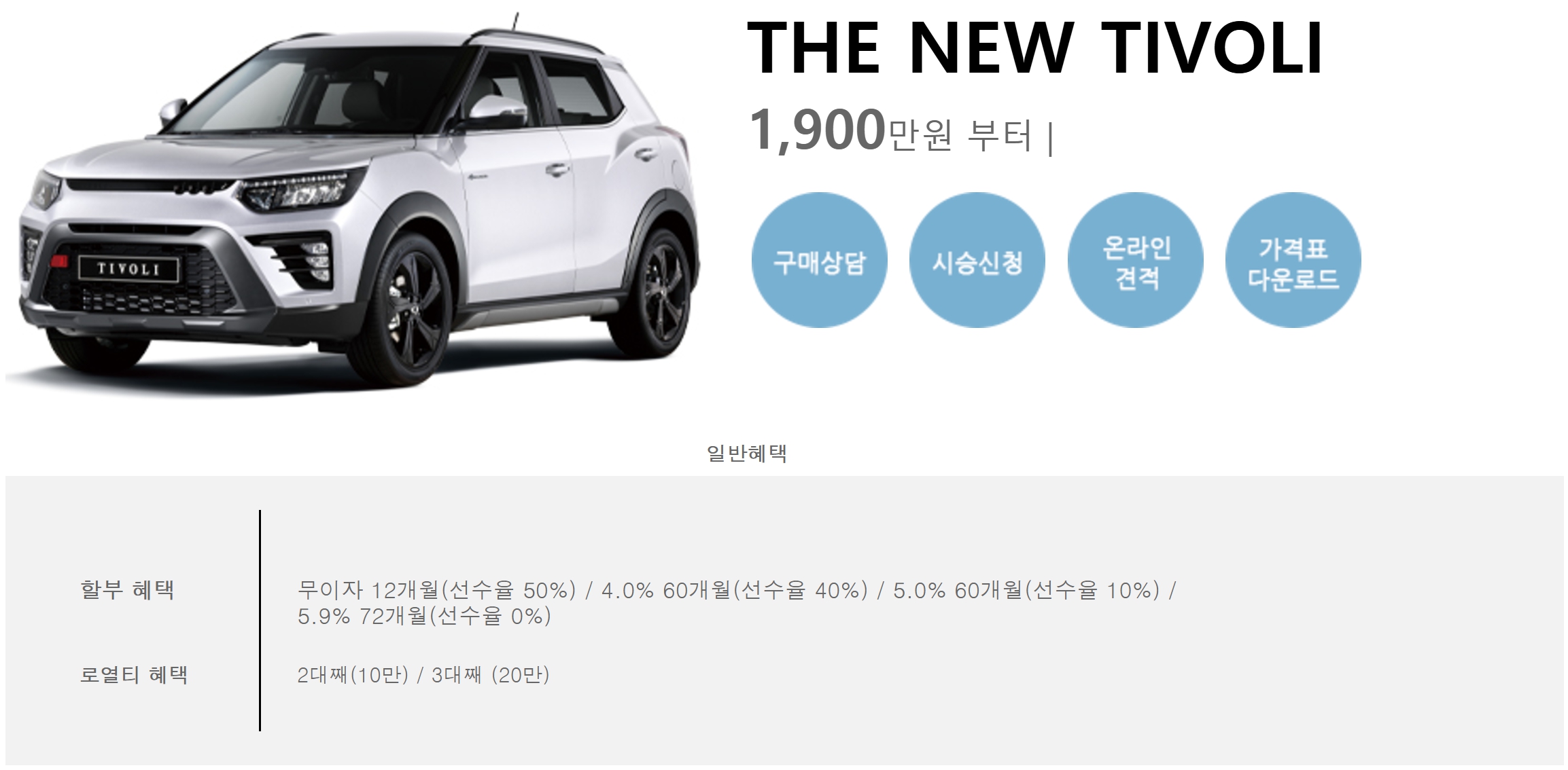 티볼리가 원래는 할인이 적은 차종은 아니었는데, 지난달에도 적은 편이었다가, 이번 달부터는 할인이 아예 없습니다.
