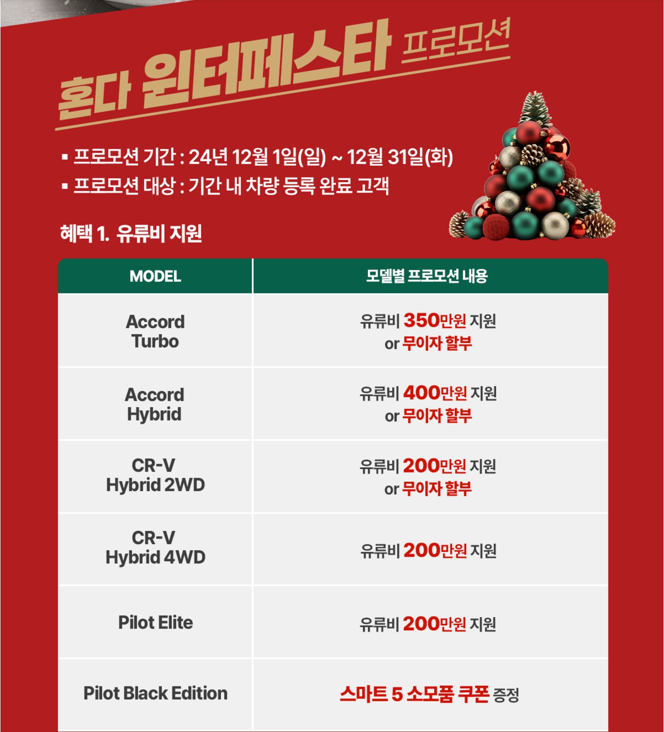 아래는 2024년 12월 프로모션 혜택을 정리한 혼다 자료입니다.