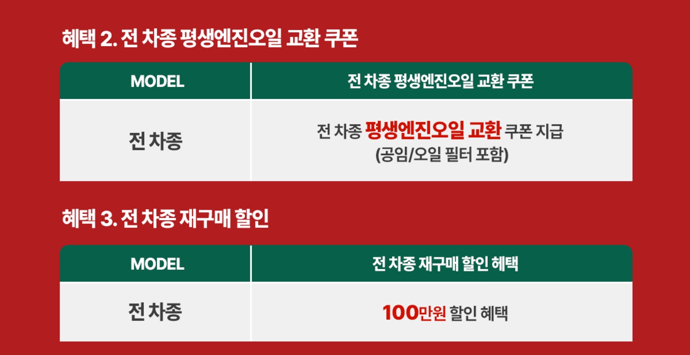 상기 할인 이 외에도, 늘 하는 평생엔진오일 교환 쿠폰 및 재구매 할인 혜택도 동일하게 있습니다.
