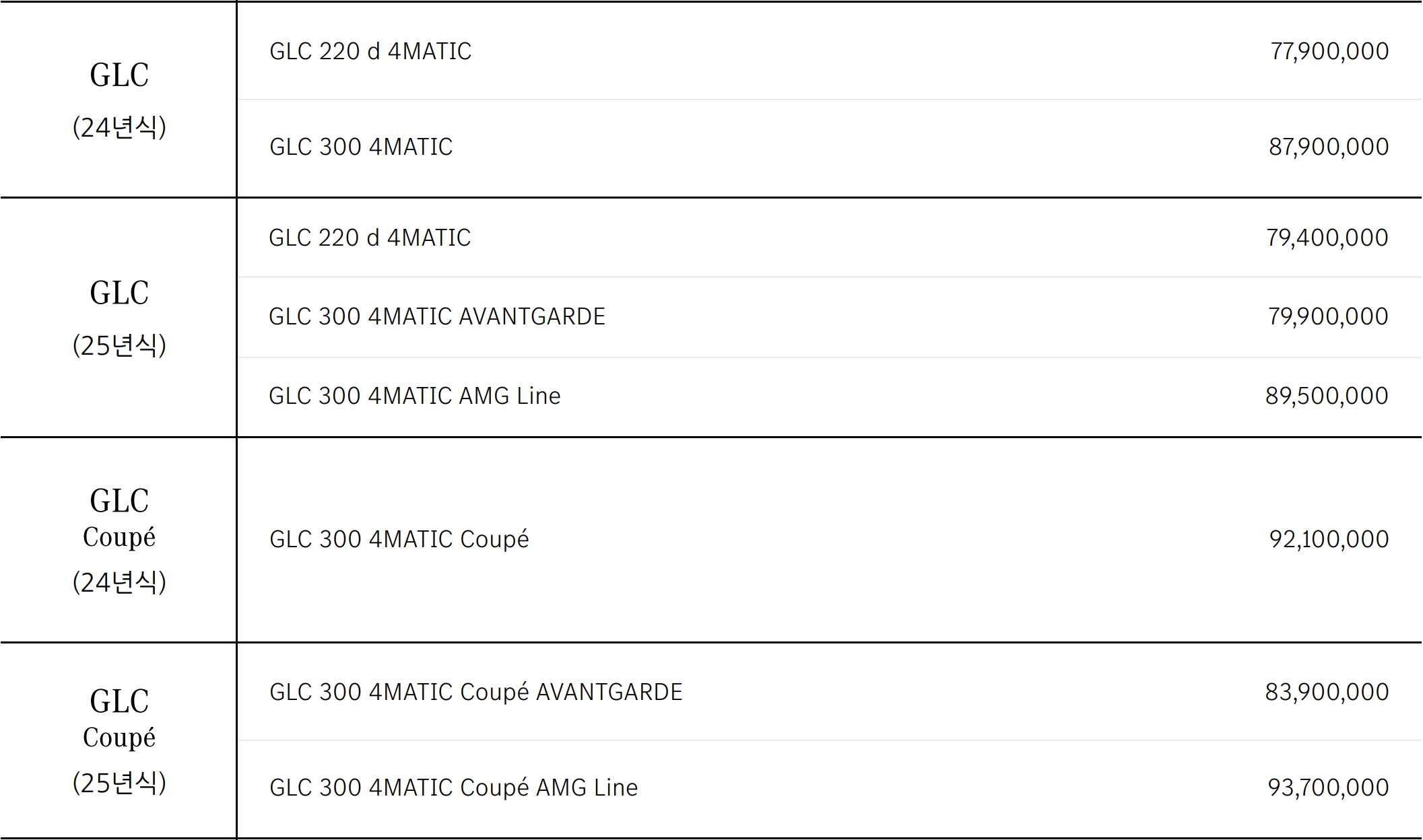 25년식이 출시하면서, GLC 및 GLC 쿠페 모두 트림이 하나 추가되었습니다.