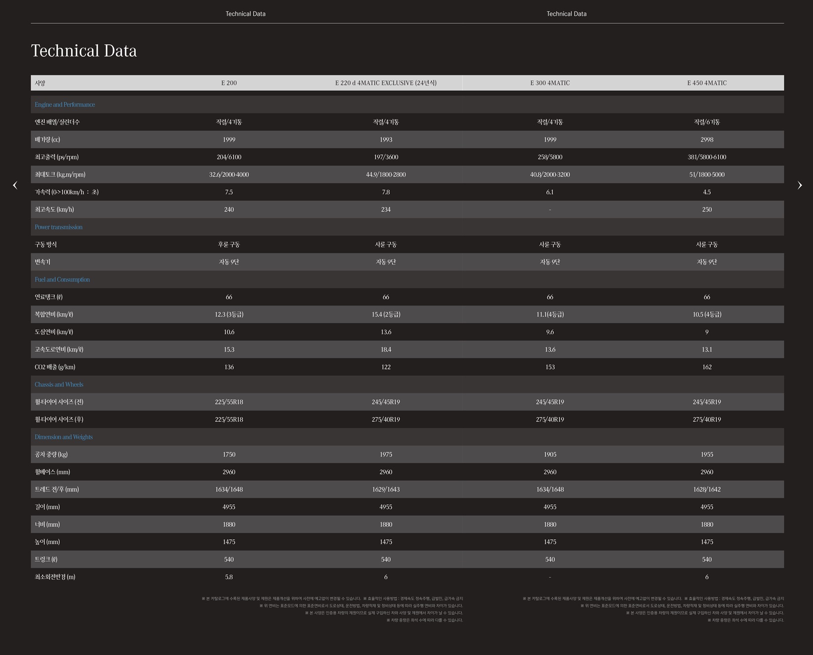 다음은 25년식 E클래스 성능을 살펴볼 수 있는 제원표 입니다.