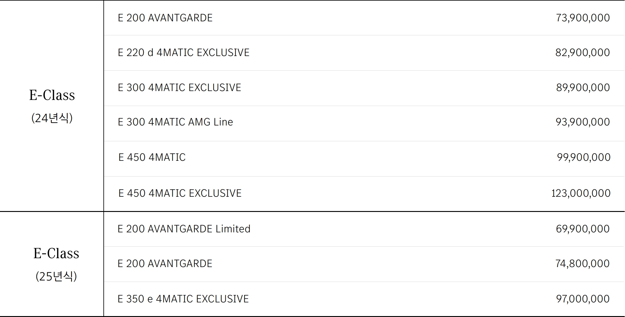 바로 앞에서 말씀드린 것과 같이, 현재 25년식 모델 가격은 E200 및 E350e만 공개가 되었고요.