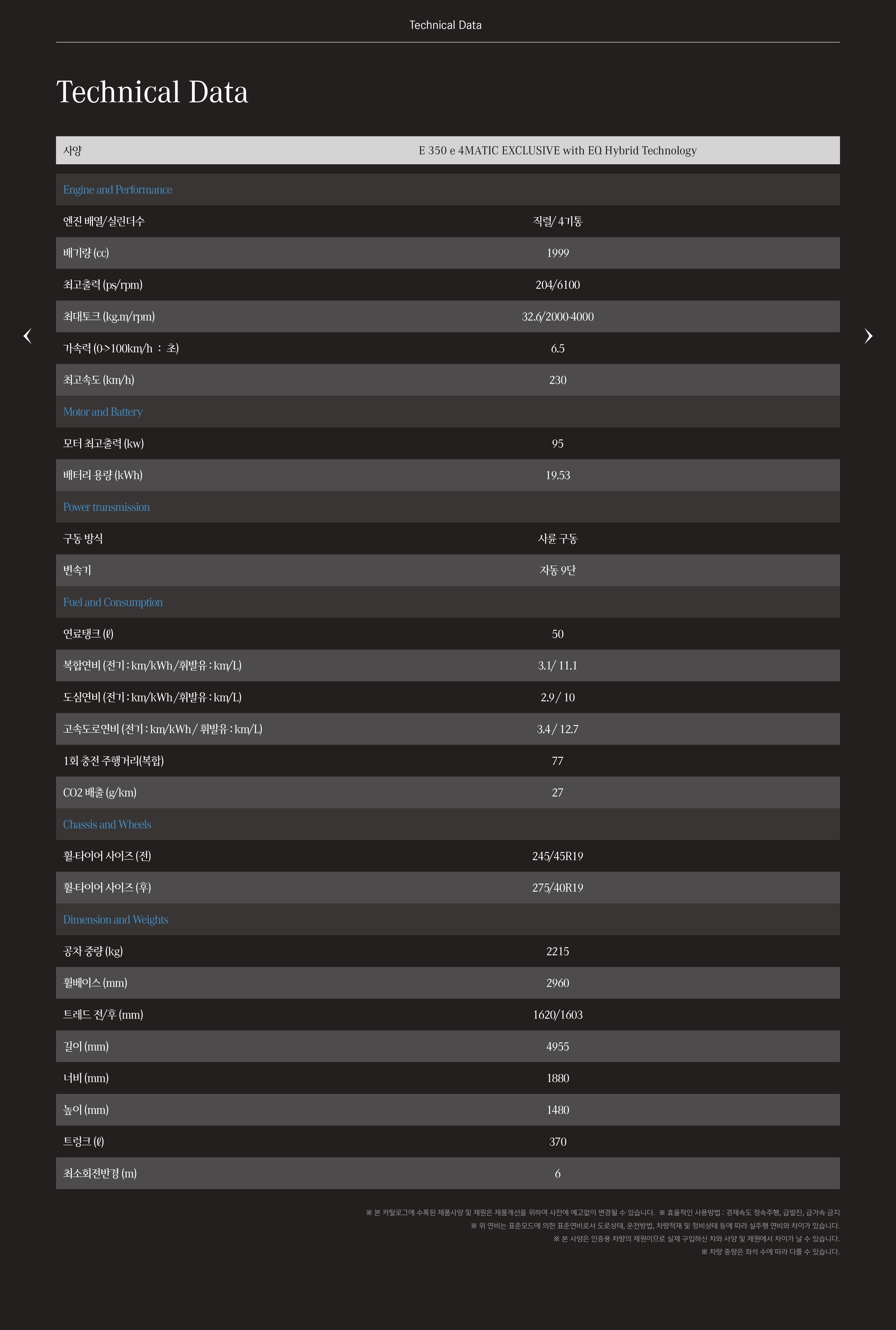 E350e는 PHEV 차량이라 그런지, 제원표가 조금 특이하여 병합은 못한 점 참고 부탁드립니다.