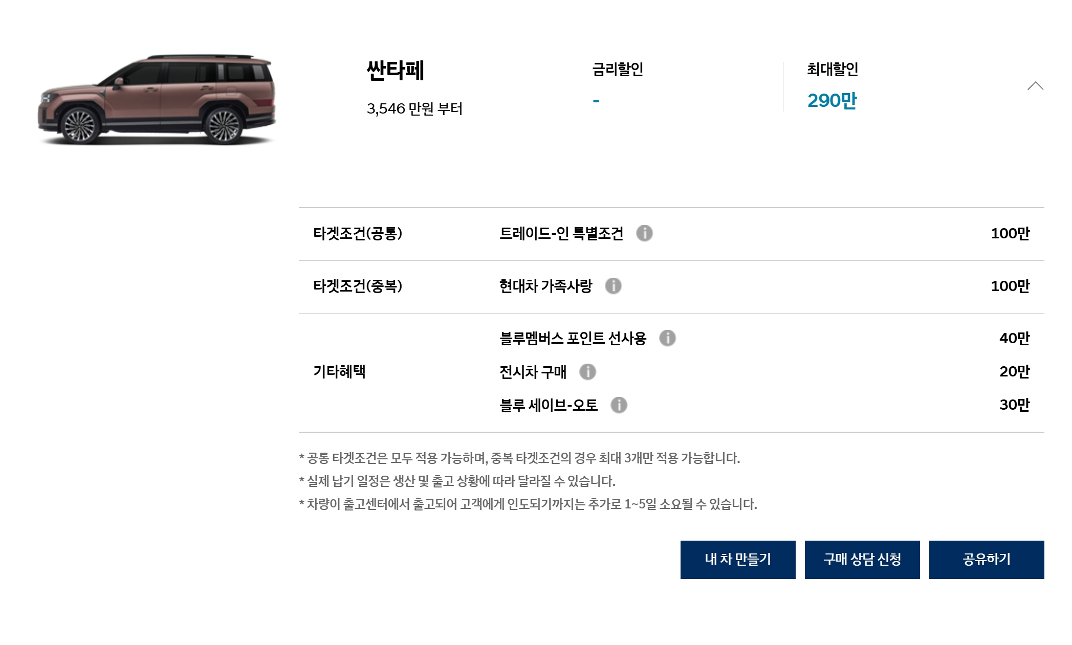 싼타페는 작년에 그랜저와 마찬가지로 종종 재고차 할인을 했던 차량이기에, 이번 달은 비추입니다.