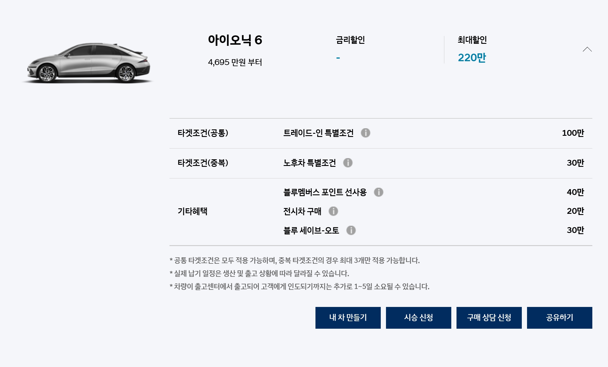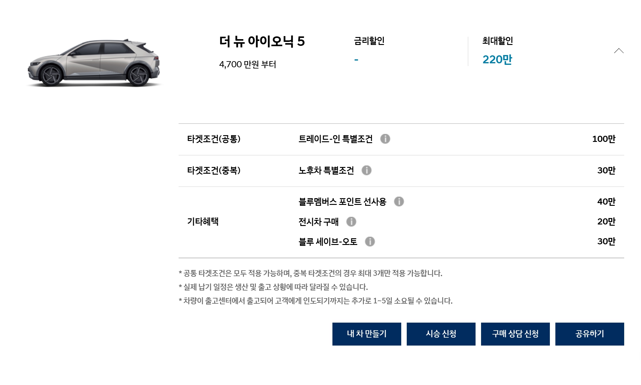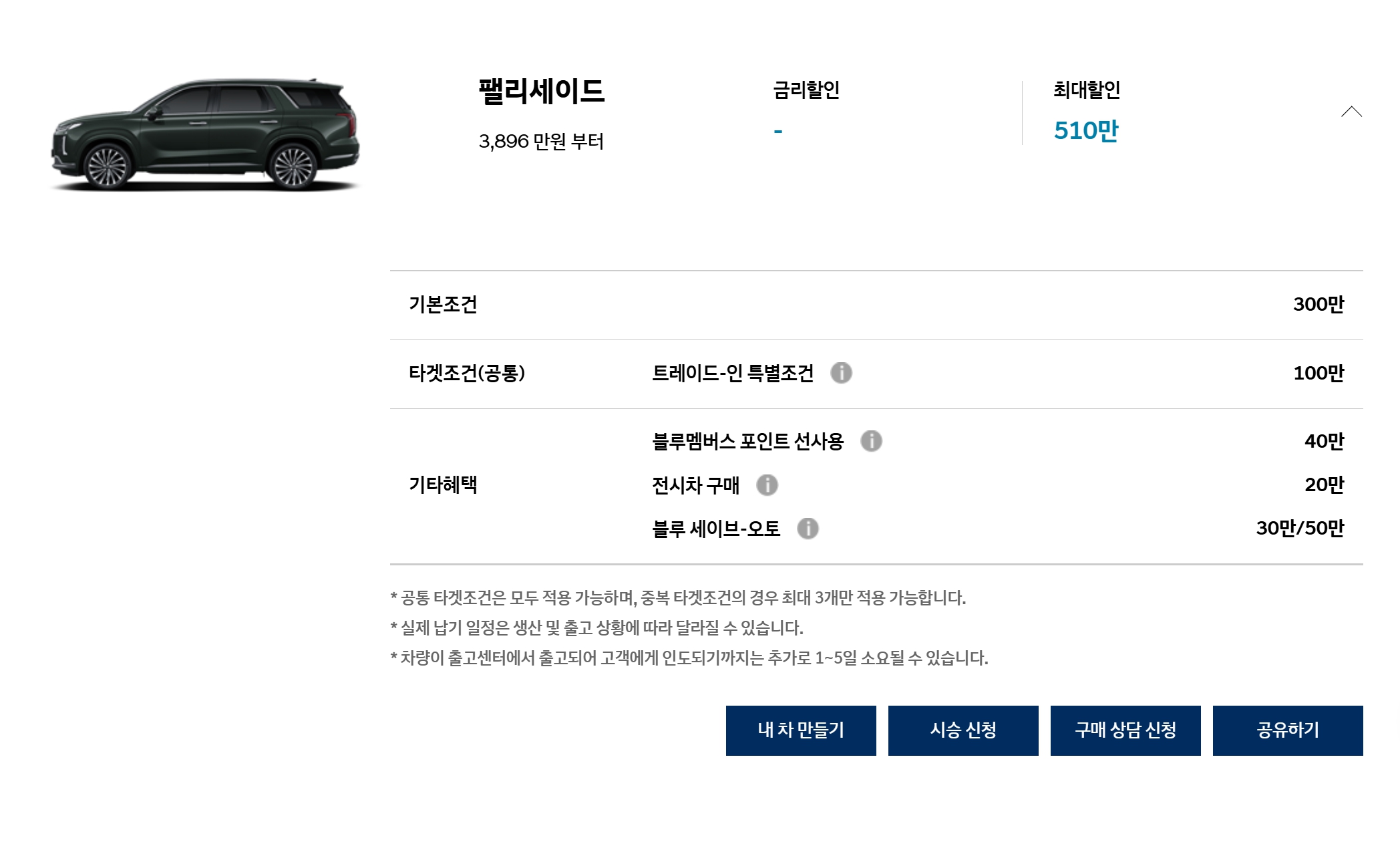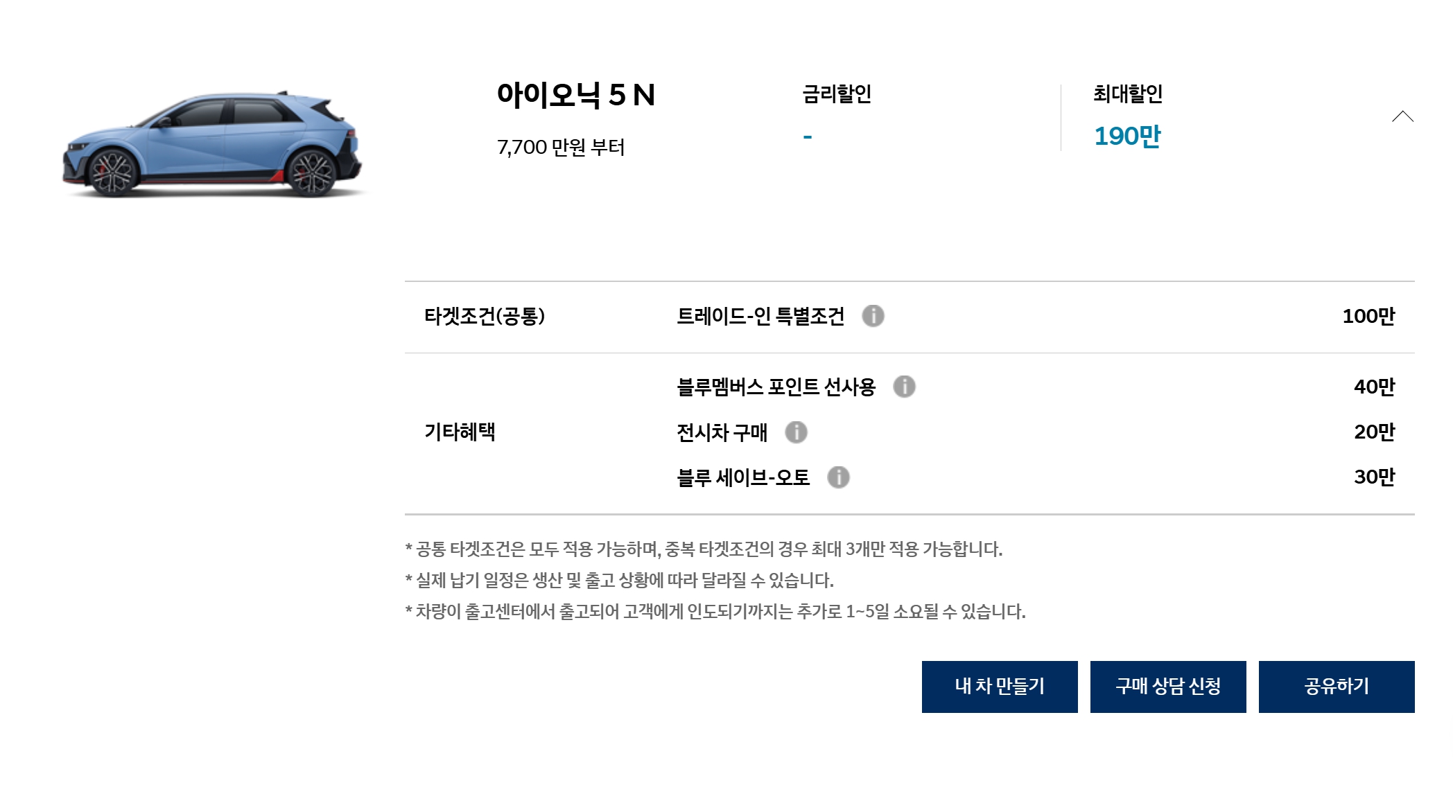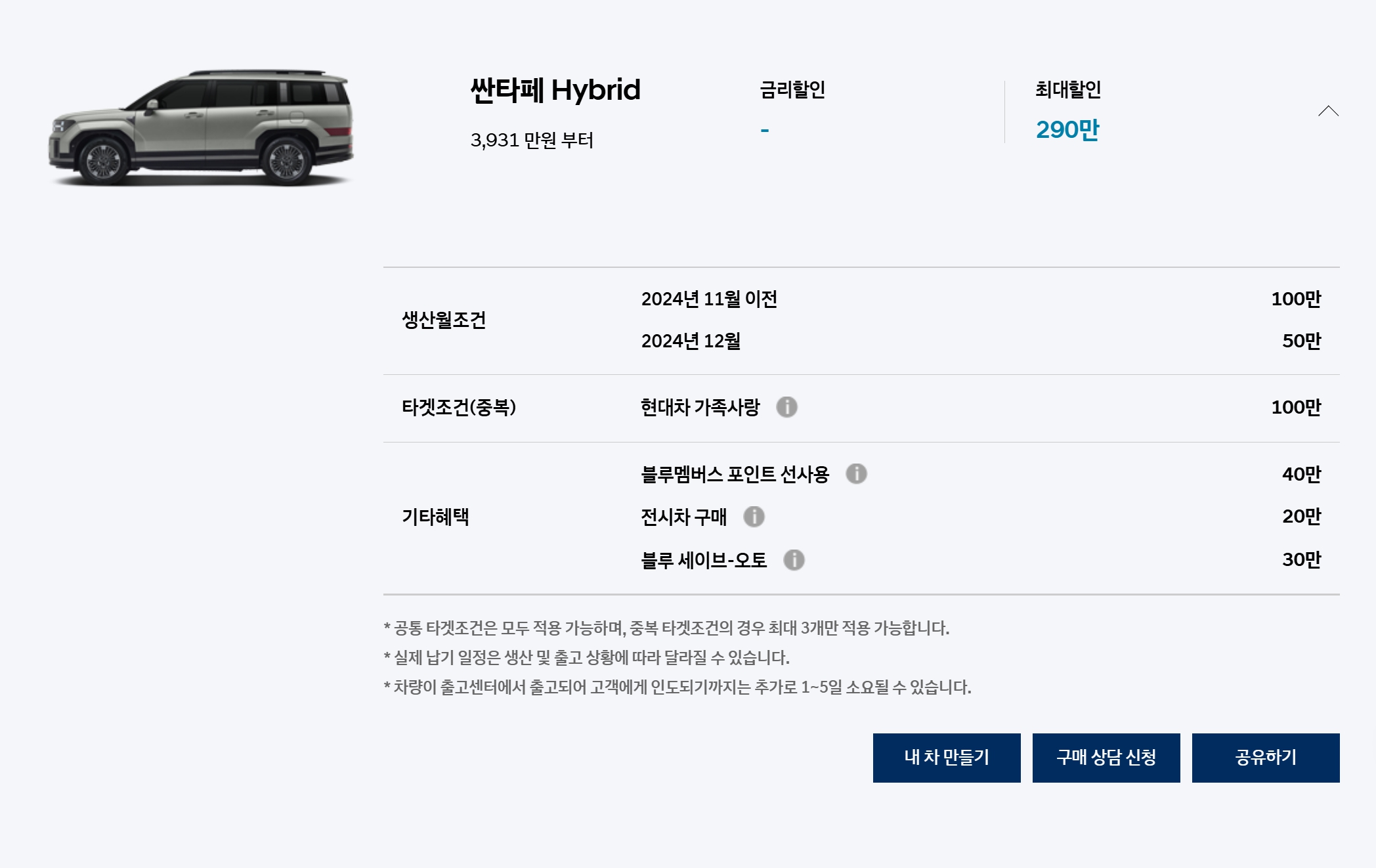 지난달은 생산월에 따라 200 ~ 500만원 할인이었다면, 이번 달은 생산월 상관없이 300만원 할인입니다.