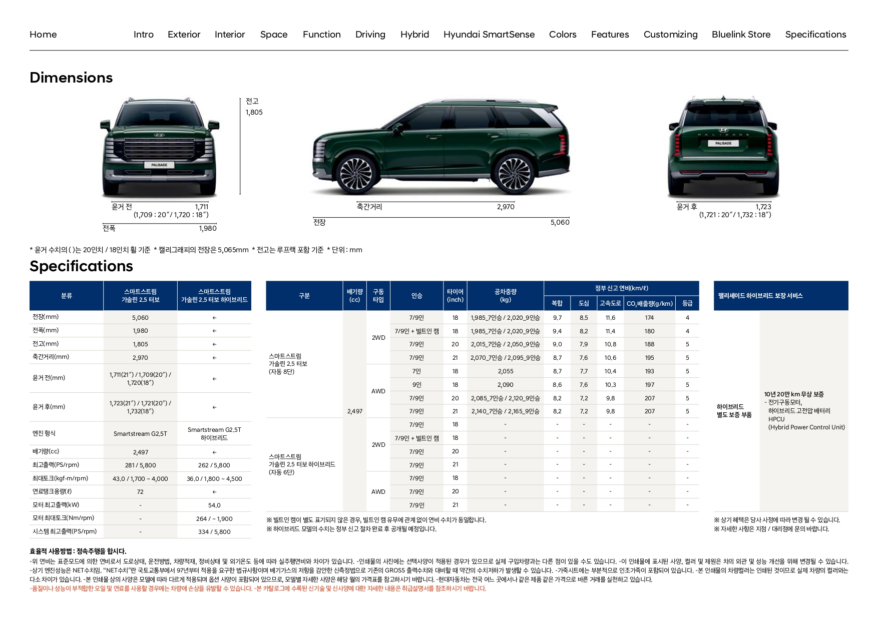 마지막으로 신형 팰리세이드의 크기 및 제원 입니다.