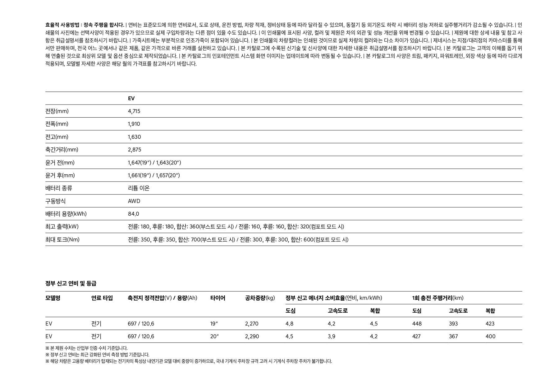 그런데, eGV70은 단일 파워트레인 사양으로 운영되어, 제원표 자체는 아래처럼 매우 간단합니다.