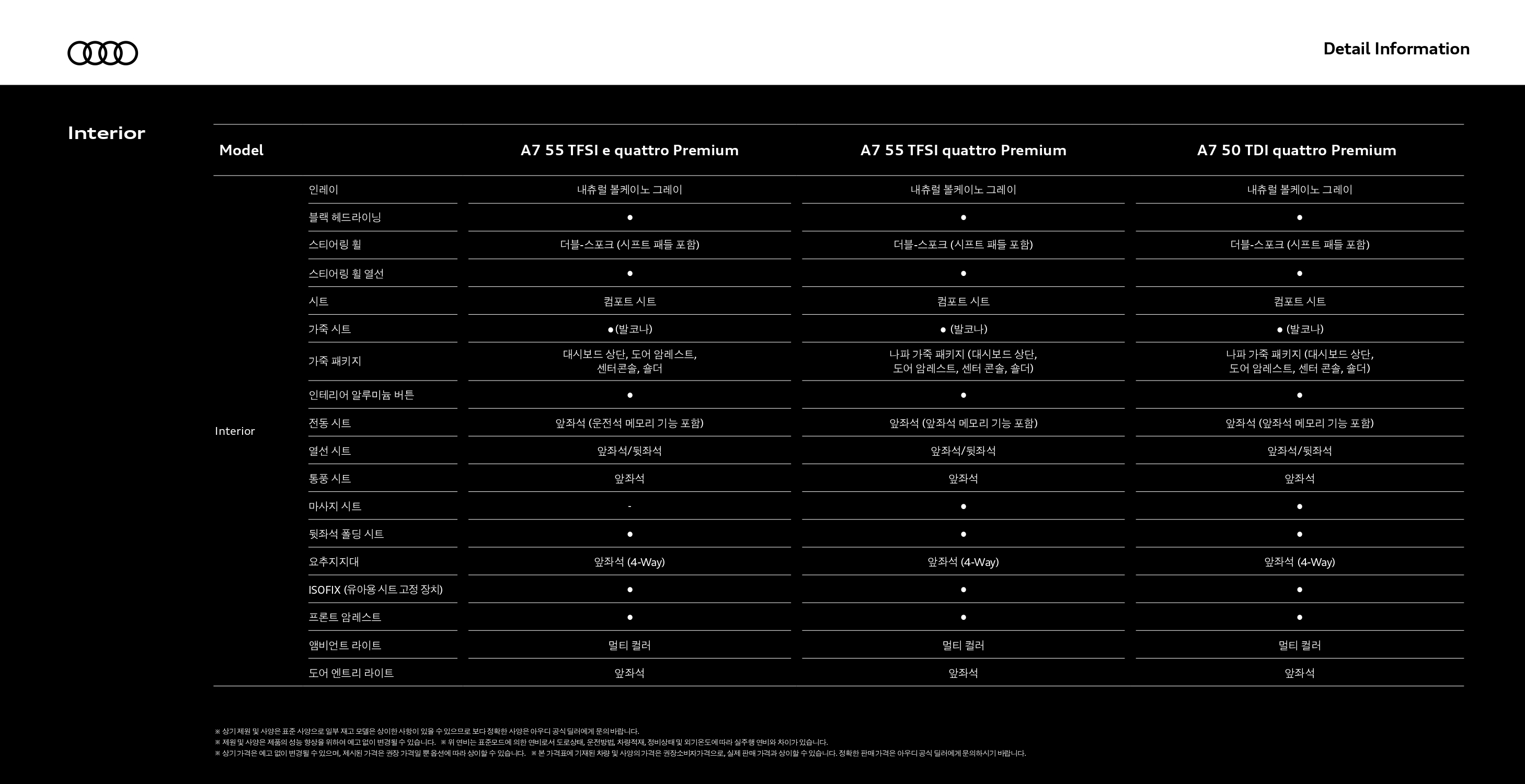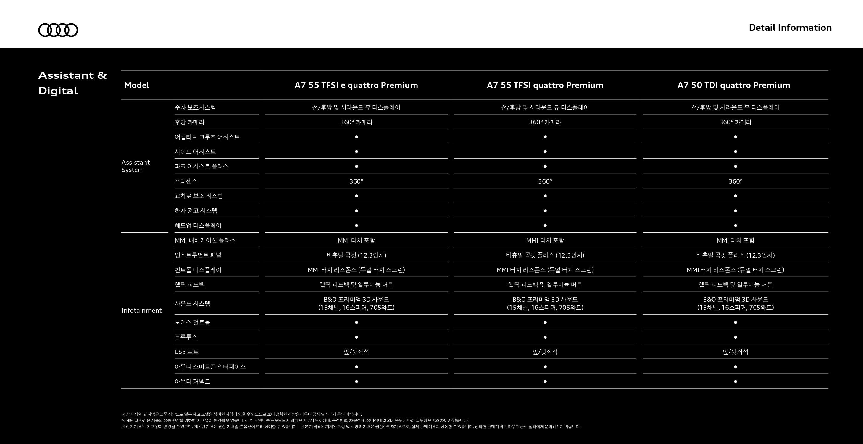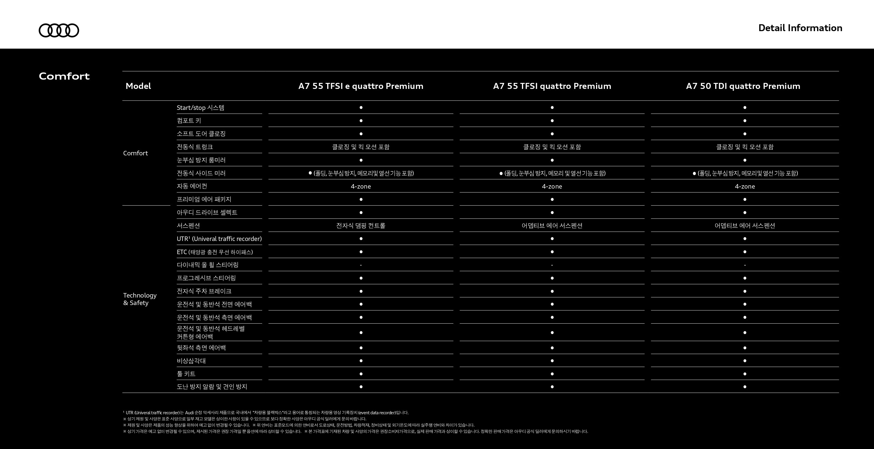 A7의 경우, 모델 자체가 고가이기 때문에, 타 아우디 라인업처럼 컴포트와 프리미엄으로 나누어져 있는 건 아니고, 전부 프리미엄 사양입니다.