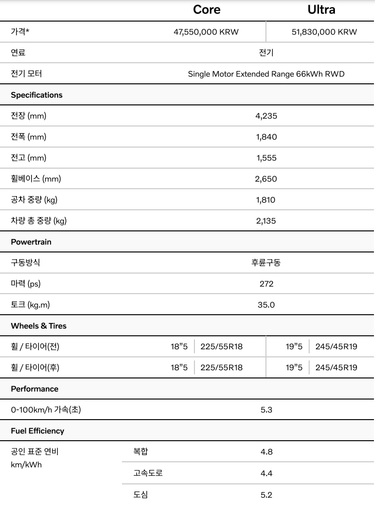 단일 파워트레인 사양으로 출시가 되었기에, 트림 간 성능 비교는 큰 의미가 없습니다.