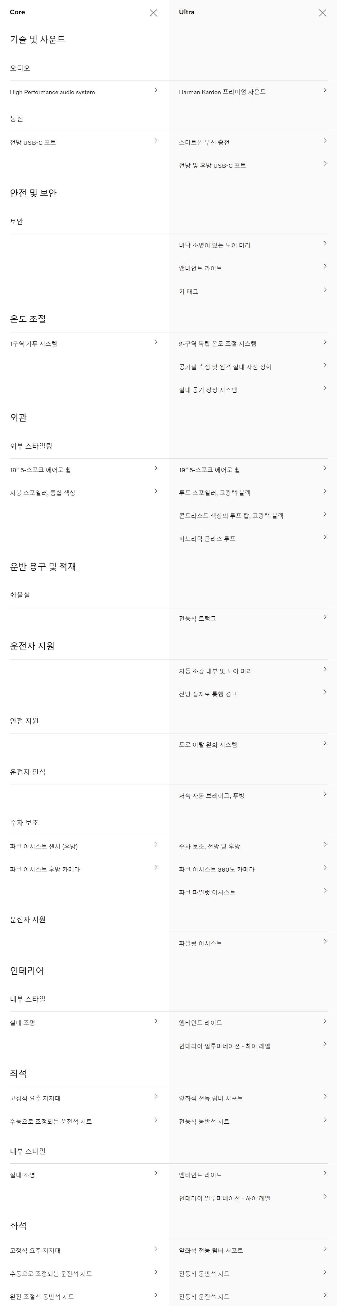 결론부터 말씀드리면, 도저히 428만원이라는 가격 차이가 믿기지 않을 정도로, 상위 트림인 울트라에 옵션이 집중되어 있습니다.