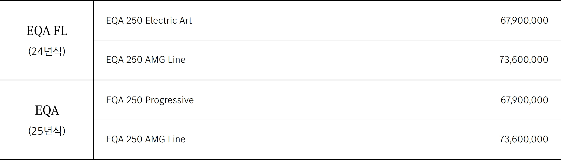 자, 그렇다면! 25년식 EQA 가격표 한 번 볼까요?