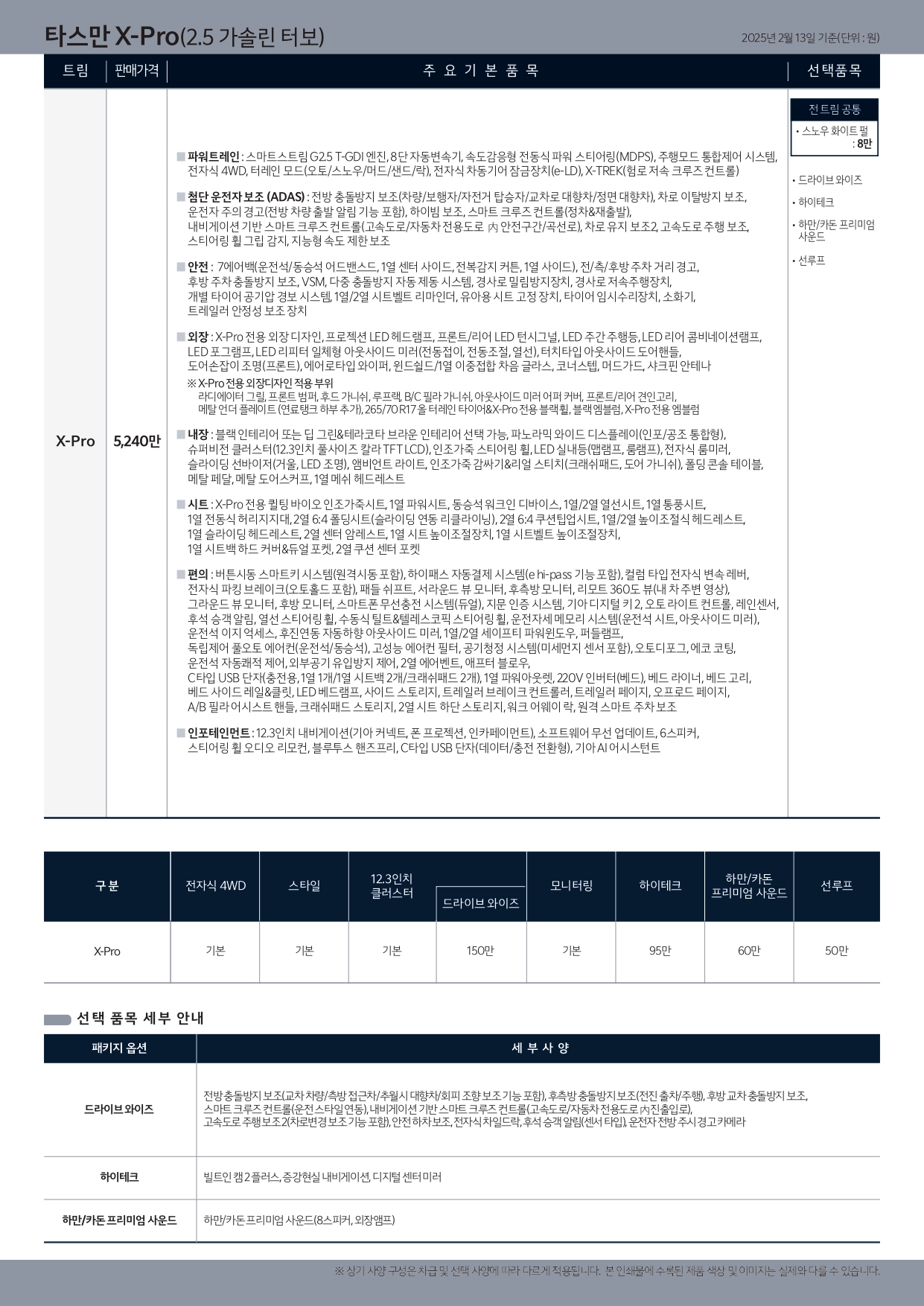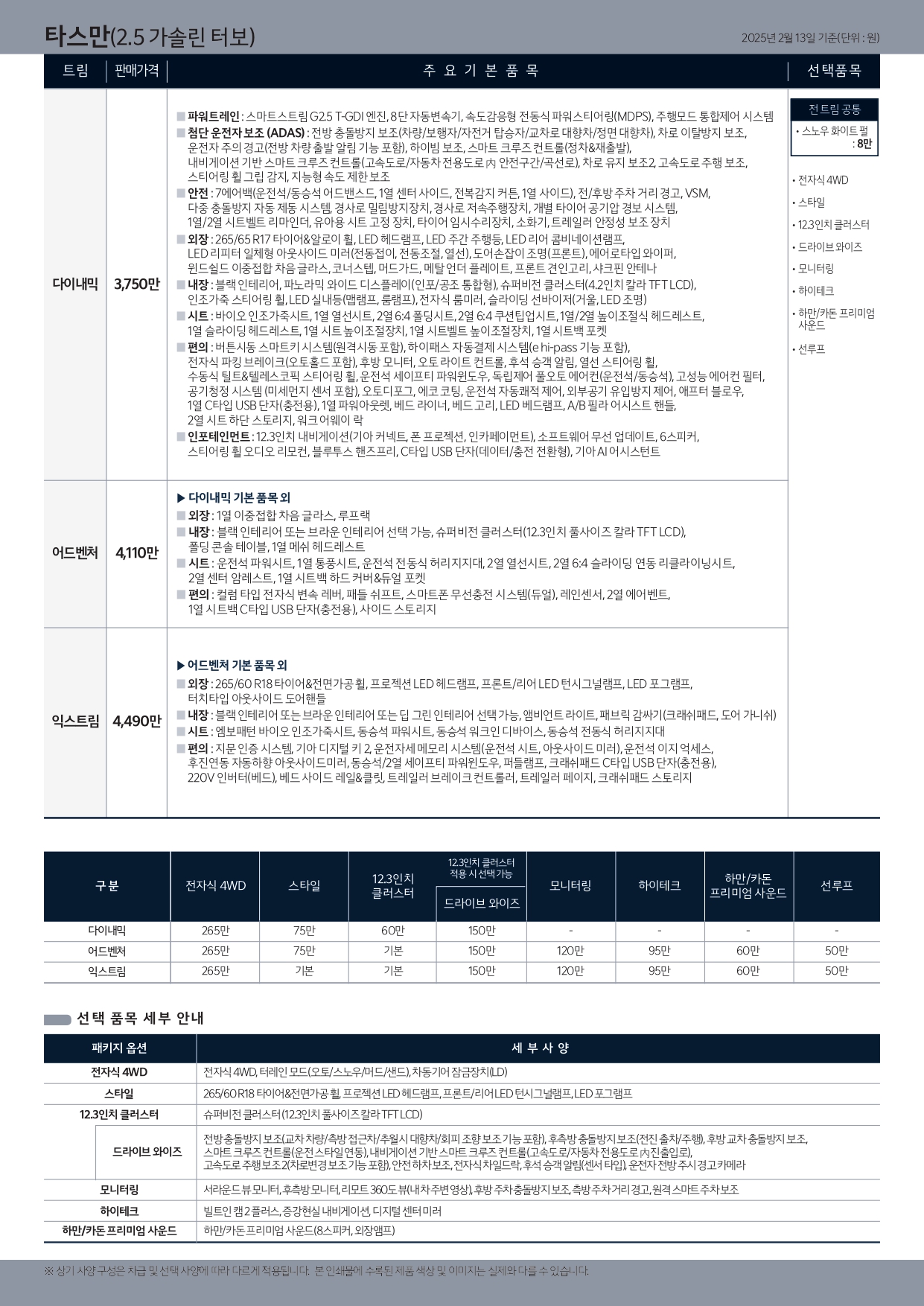 사실, 이 부분이 타스만 가격표에서 조금 아쉬운 부분인게...기본형인 다이내믹은 선택이 사실상 불가합니다.
