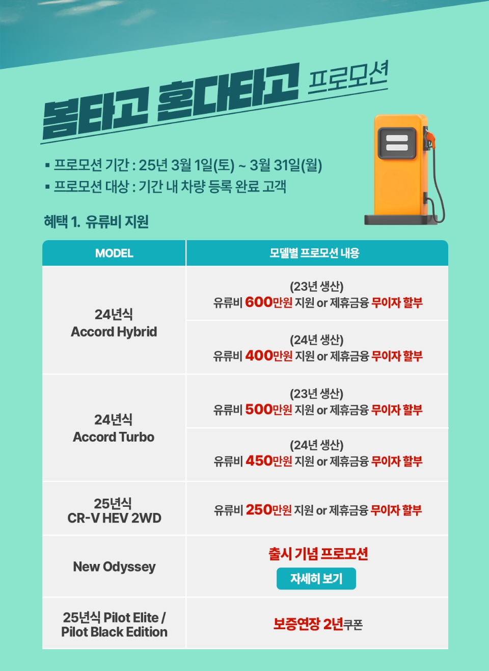 오늘은 여러분들께 2025년 3월 혼다 전차종 가격 및 프로모션을 안내해 드리도록 하겠습니다.