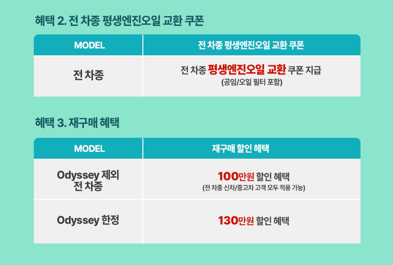 아래는 공통으로 적용되는 평생엔진오일 프로모션 및 재구매 혜택입니다.