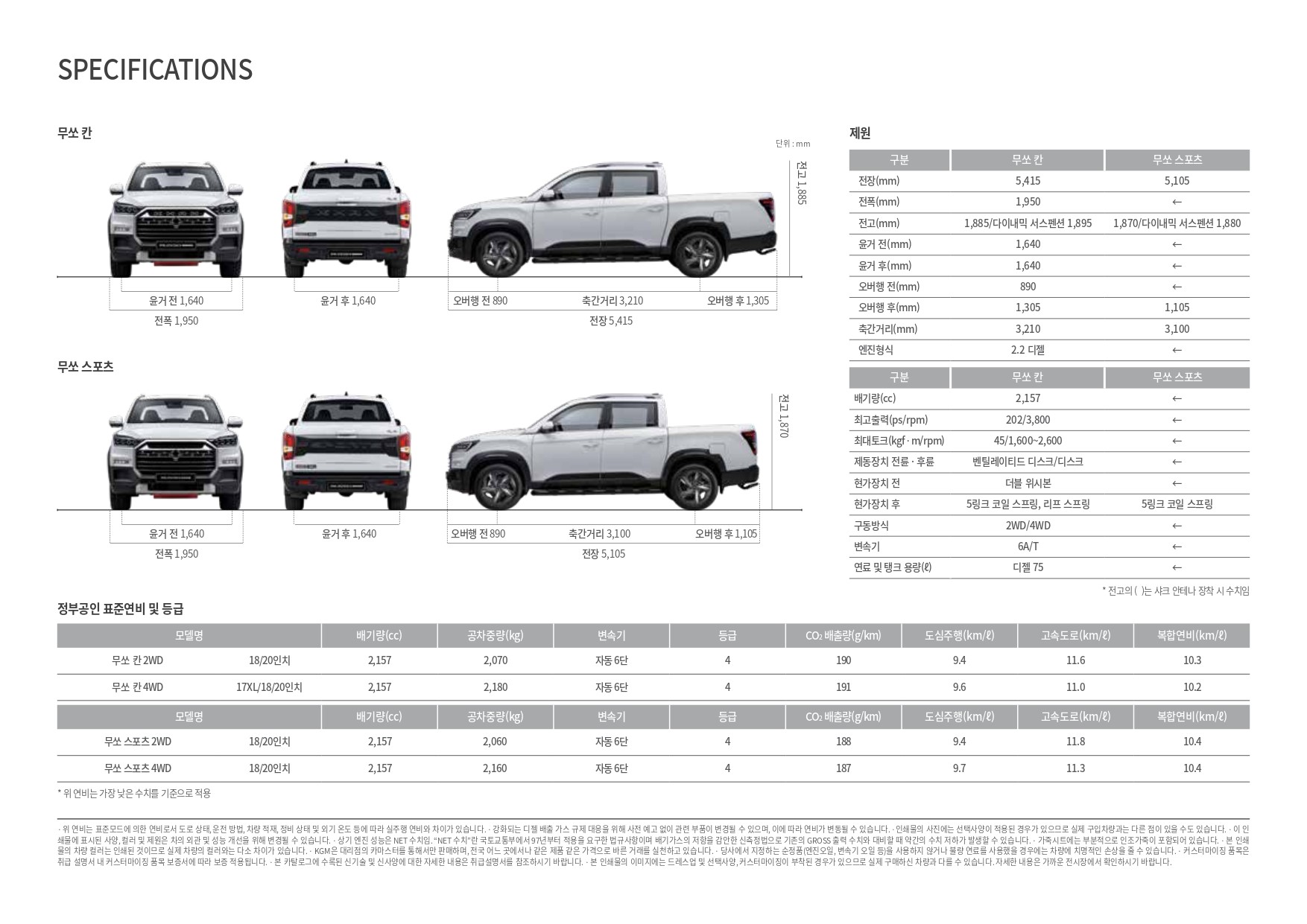 다음은 2025 무쏘 스포츠, 무쏘 칸 제원입니다.