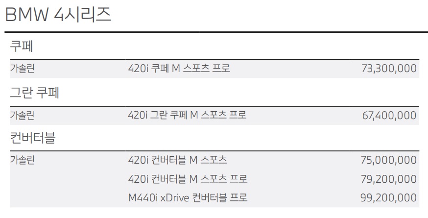 그란쿠페의 경우, i4 라인업이 일부 추가되었고, 가격도 일부 변동이 있습니다.