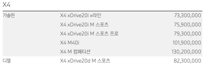 X4 xDrive20i M 스포츠 모델을 제외한 나머지 모든 라인업이 가격 인상 되었습니다.