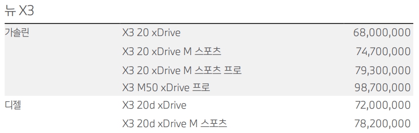 BMW X3 가격표