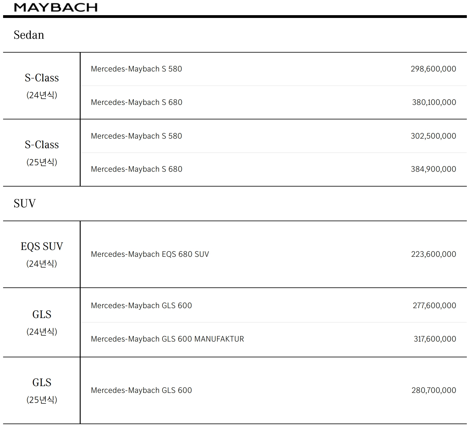 마이바흐 라인업 또한 가격 변경은 없습니다.