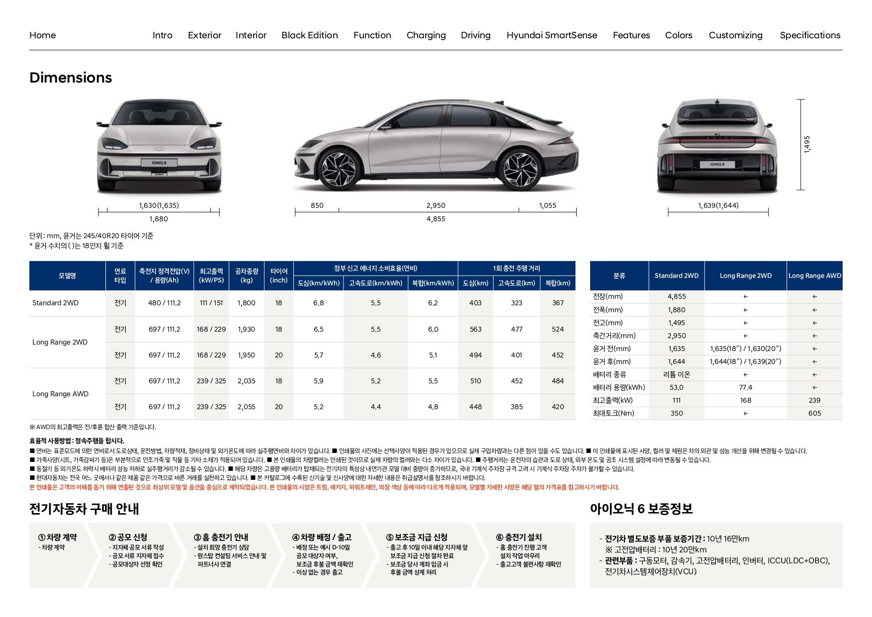 마지막으로 아이오닉 6의 제원표인데, 많이들 궁금해하시는 주행가능거리가 보기 좋게 정리되어 있습니다.