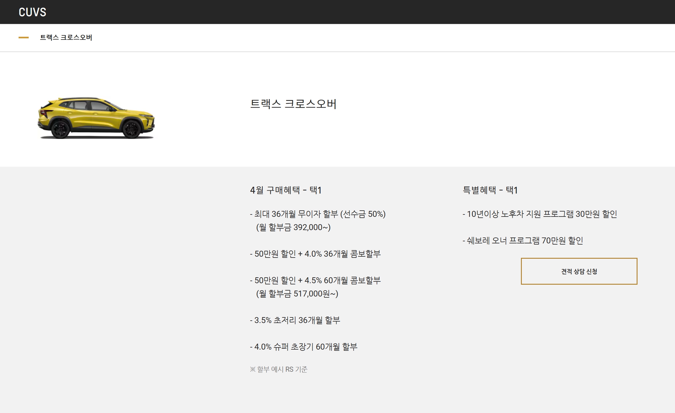 이번 달은 무이자할부가 생긴 트랙스가 그나마 조건이 좋아진 편이고, 나머지는 이전 달과 동일합니다.