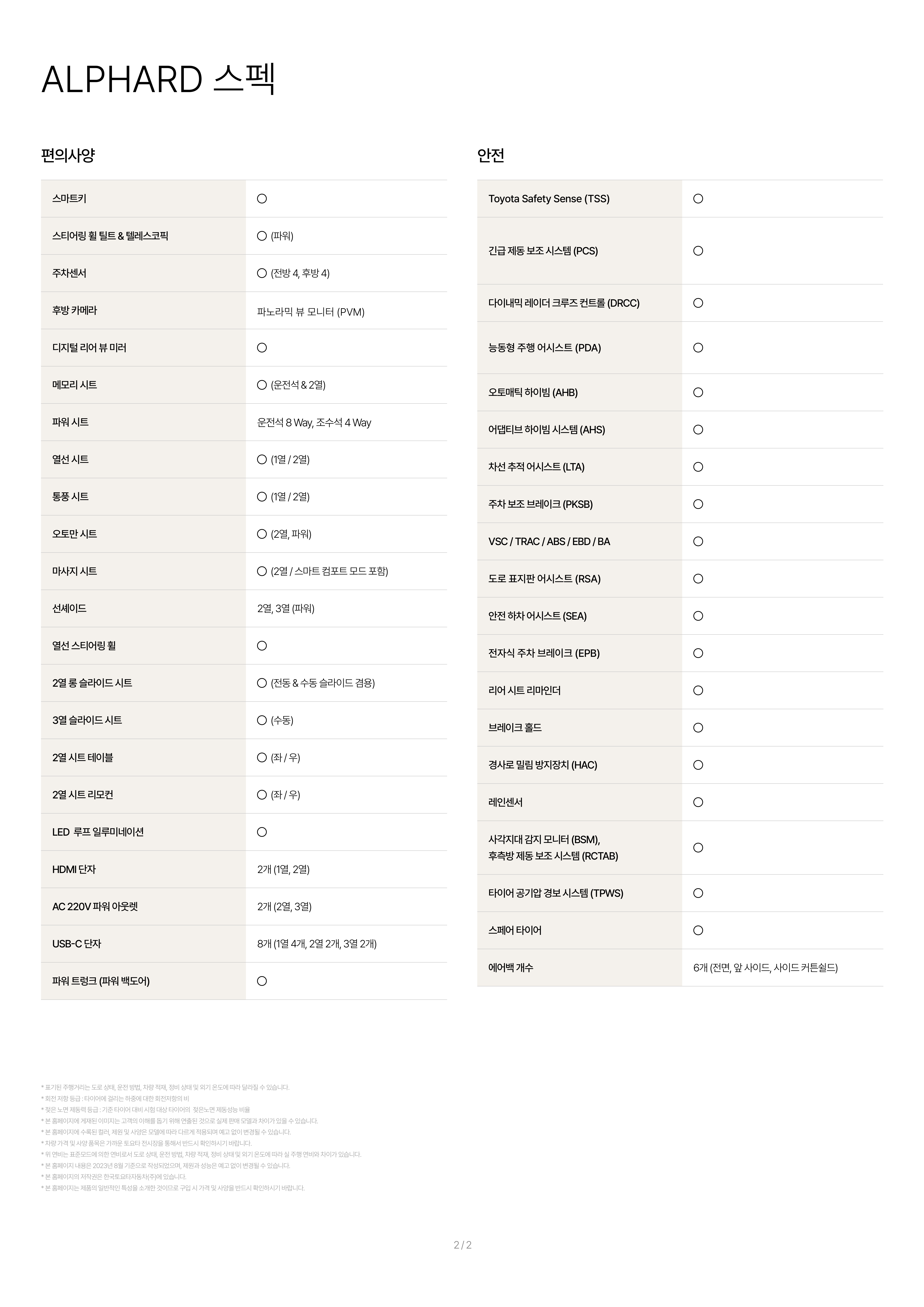 다음은 많이들 궁금해하실 것 같은 옵션표인데, 국내 출시 사양이 단일 트림이라, 트림 간 비교는 불가하고, 알파드 옵션이 대략 이 정도구나! 참고하시는 정도로 보시면 되겠습니다.