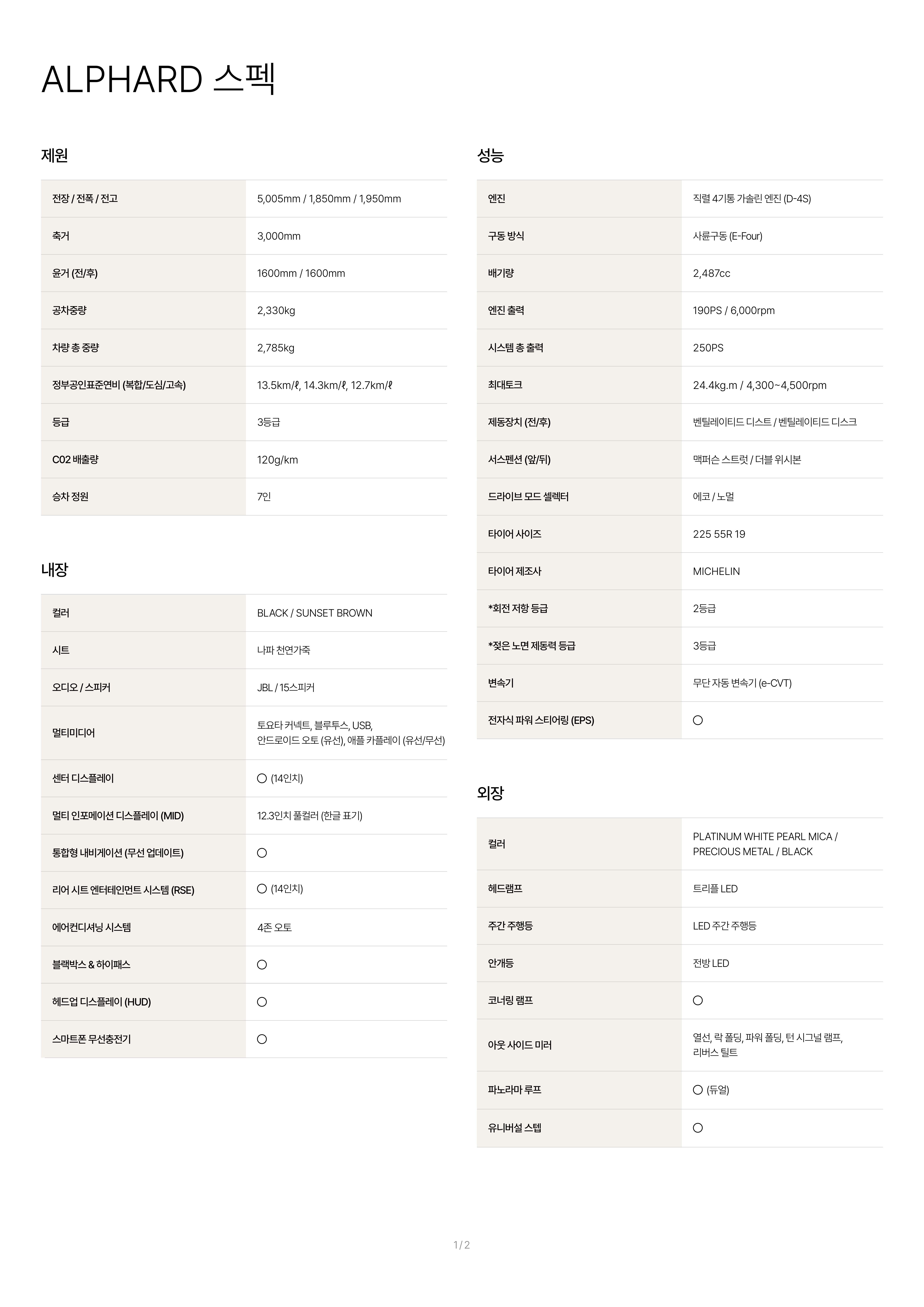 아래는 바로 위에서 보여드린 알파드 가격표 및 제원 PDF 파일로, 이게 보기 편하신 분들께서는 받아서 보시면 되겠습니다.