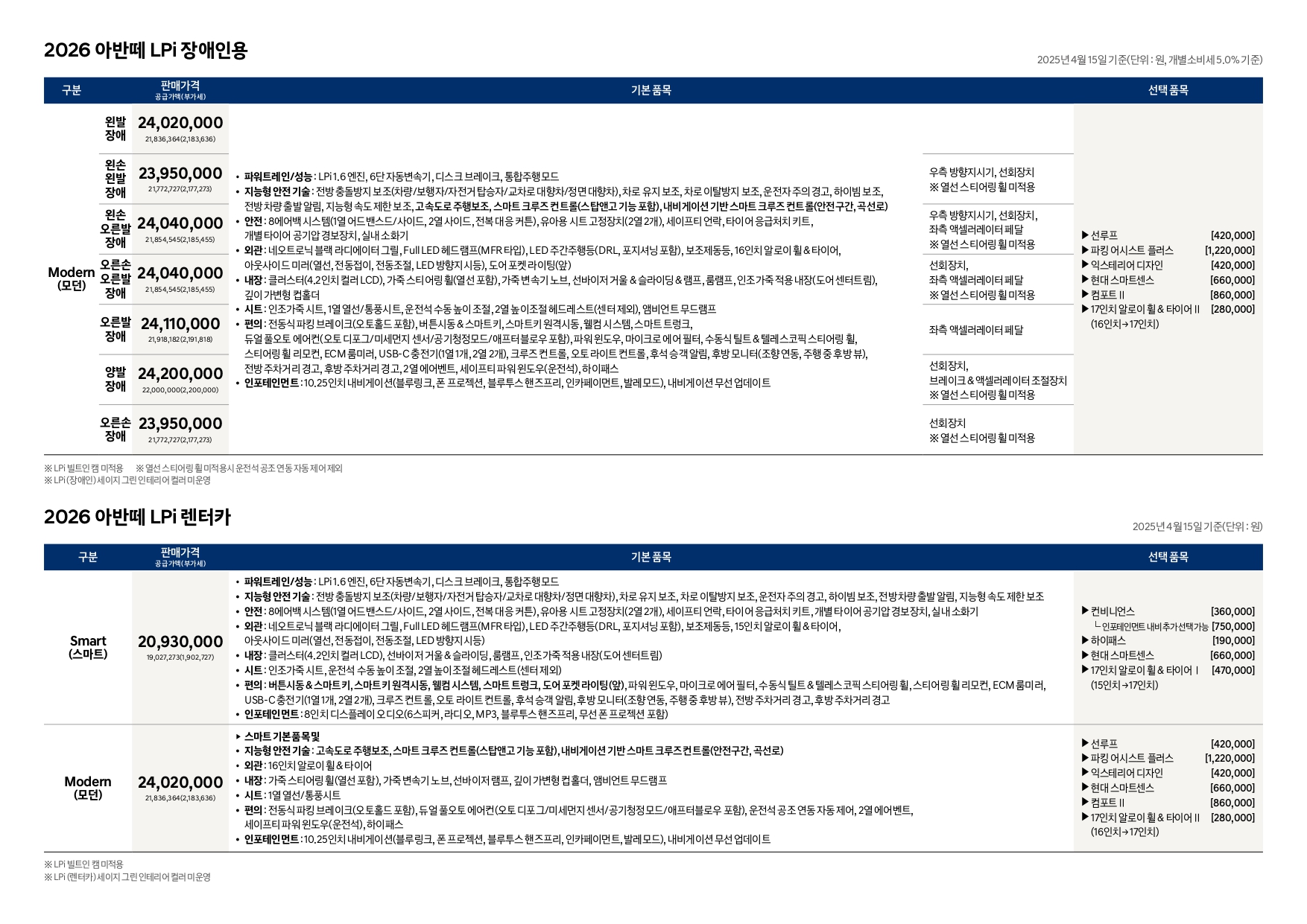 다음은 LPi 장애인용 및 렌터카 사양입니다.
