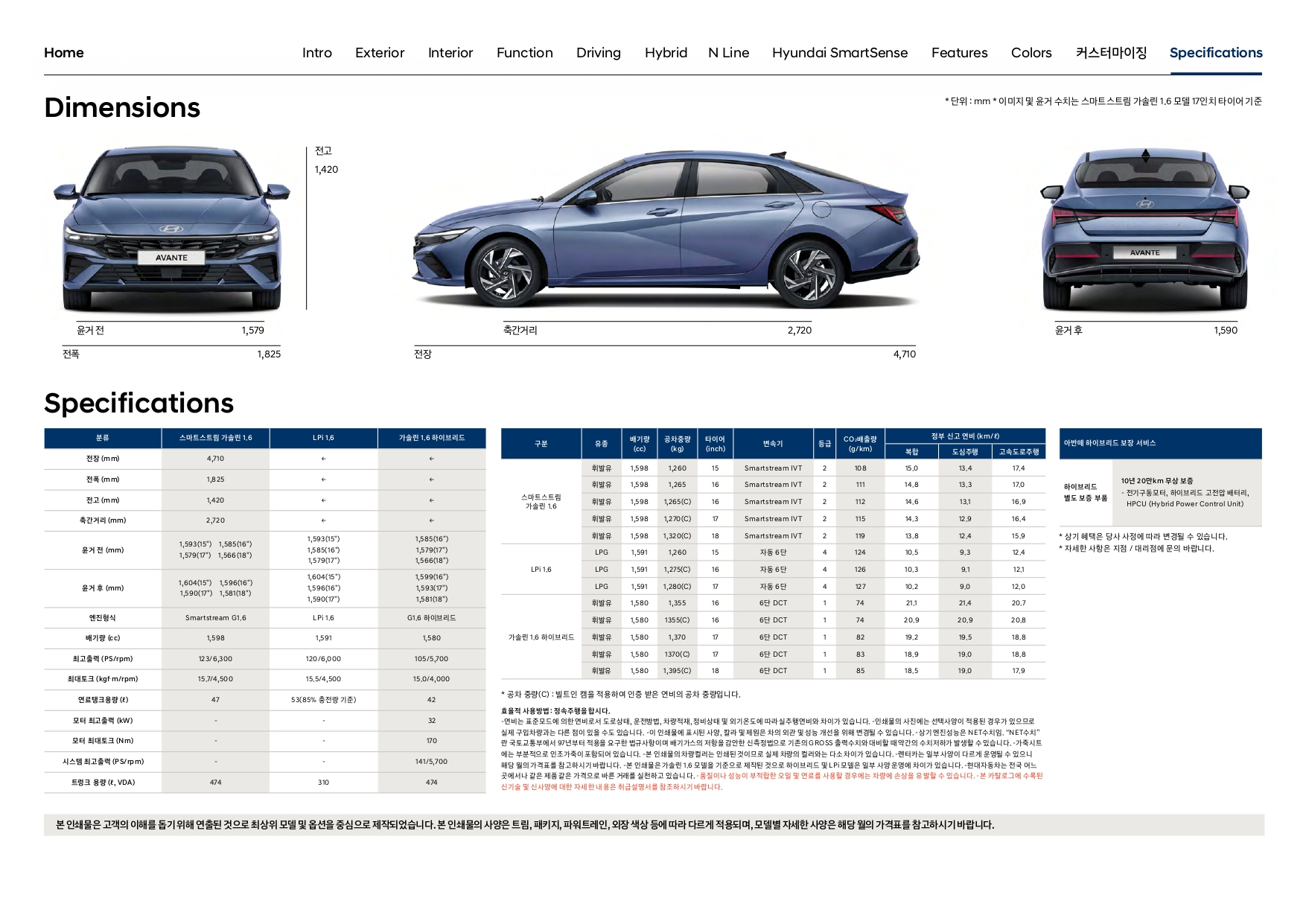 마지막으로 아반떼 / 아반떼 하이브리드 / 아반떼 N 세 차종의 제원입니다.
