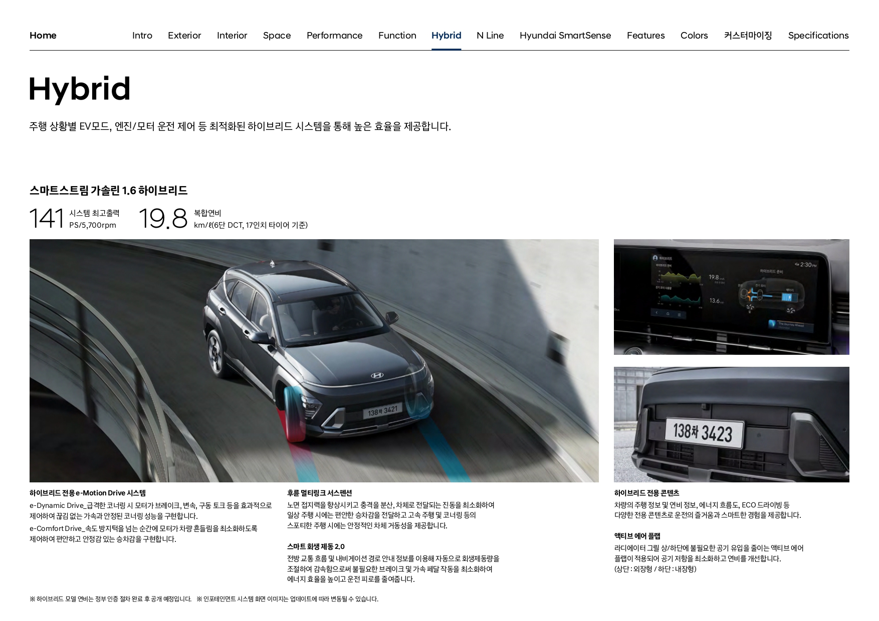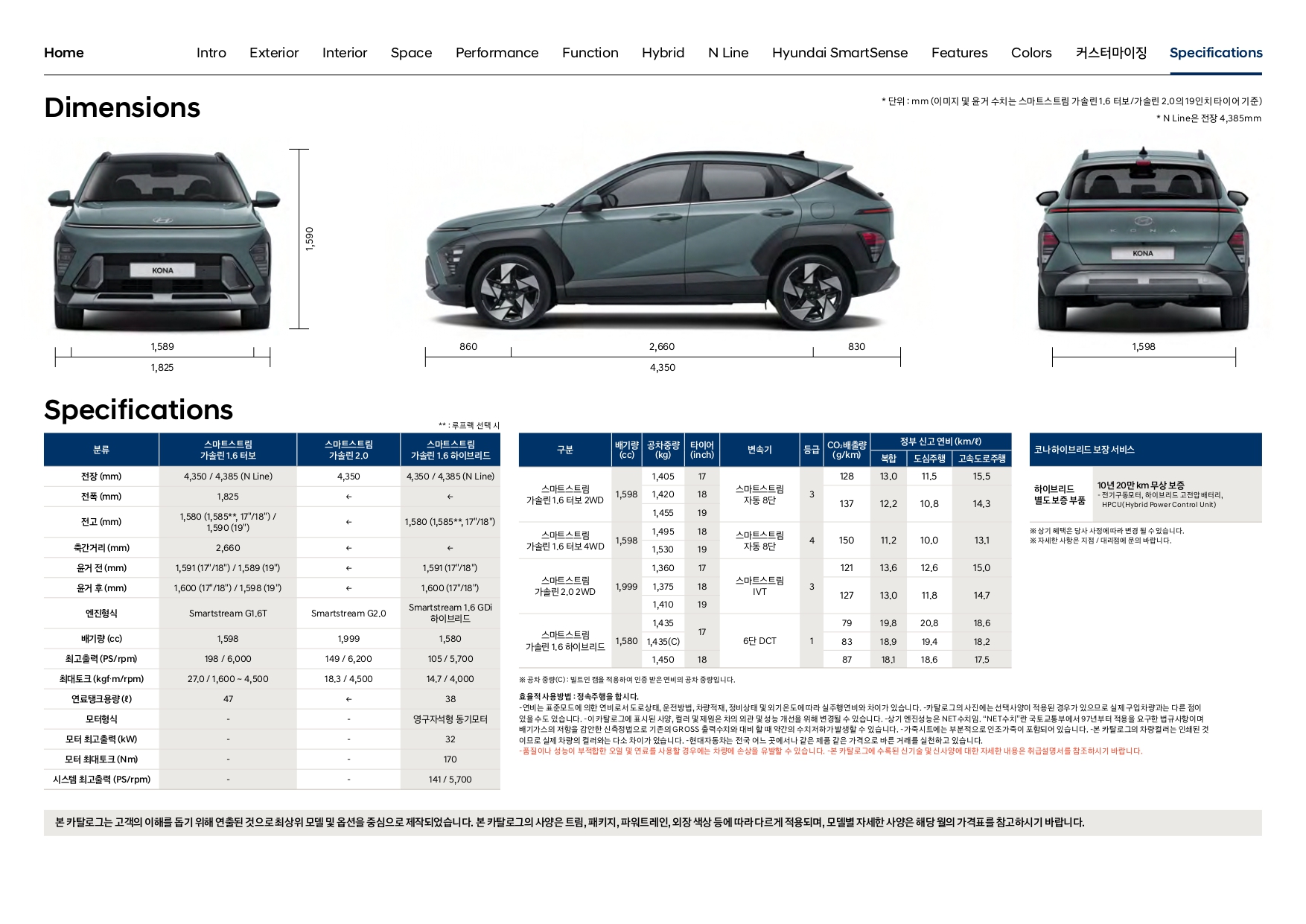 코나 가솔린 및 코나 하이브리드 두 모델 모두의 제원과 연비 정보를 확인하실 수가 있습니다.