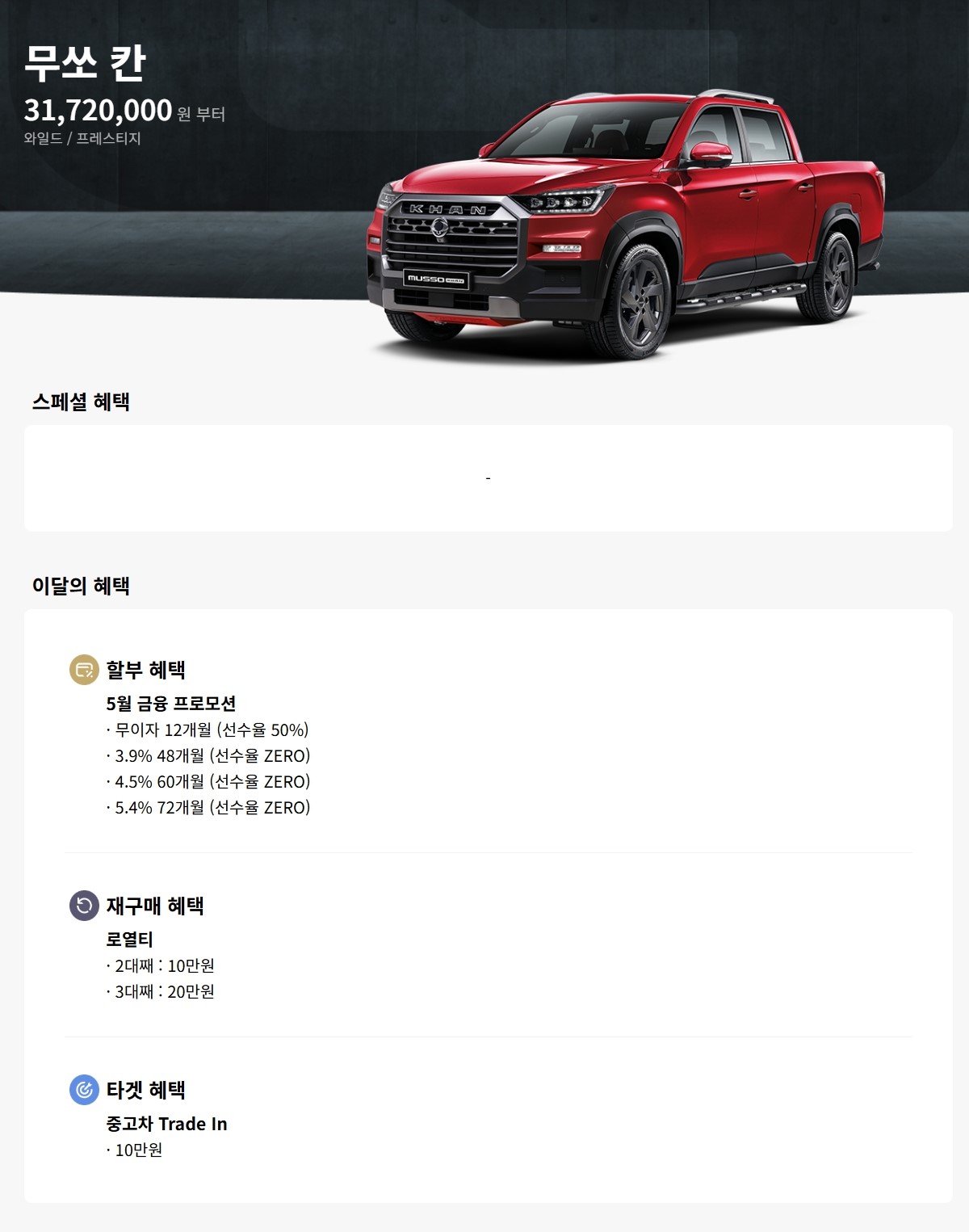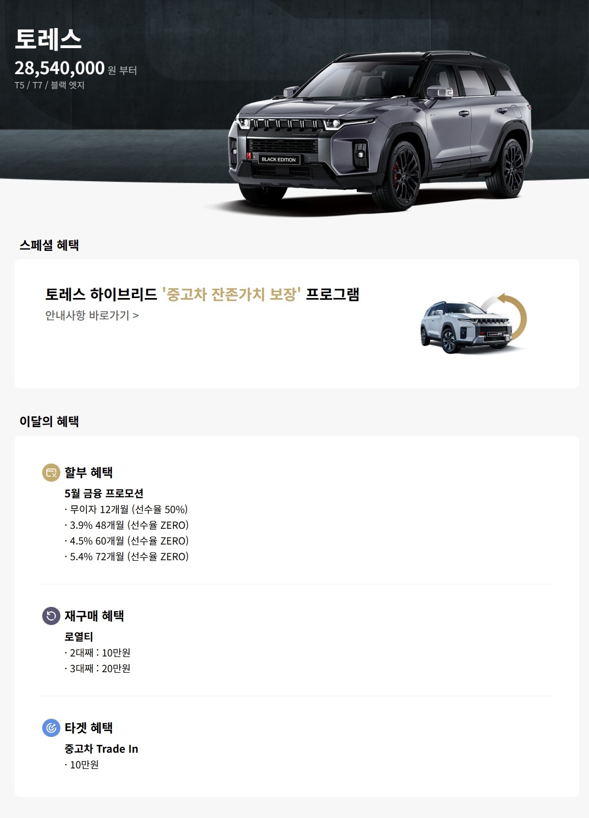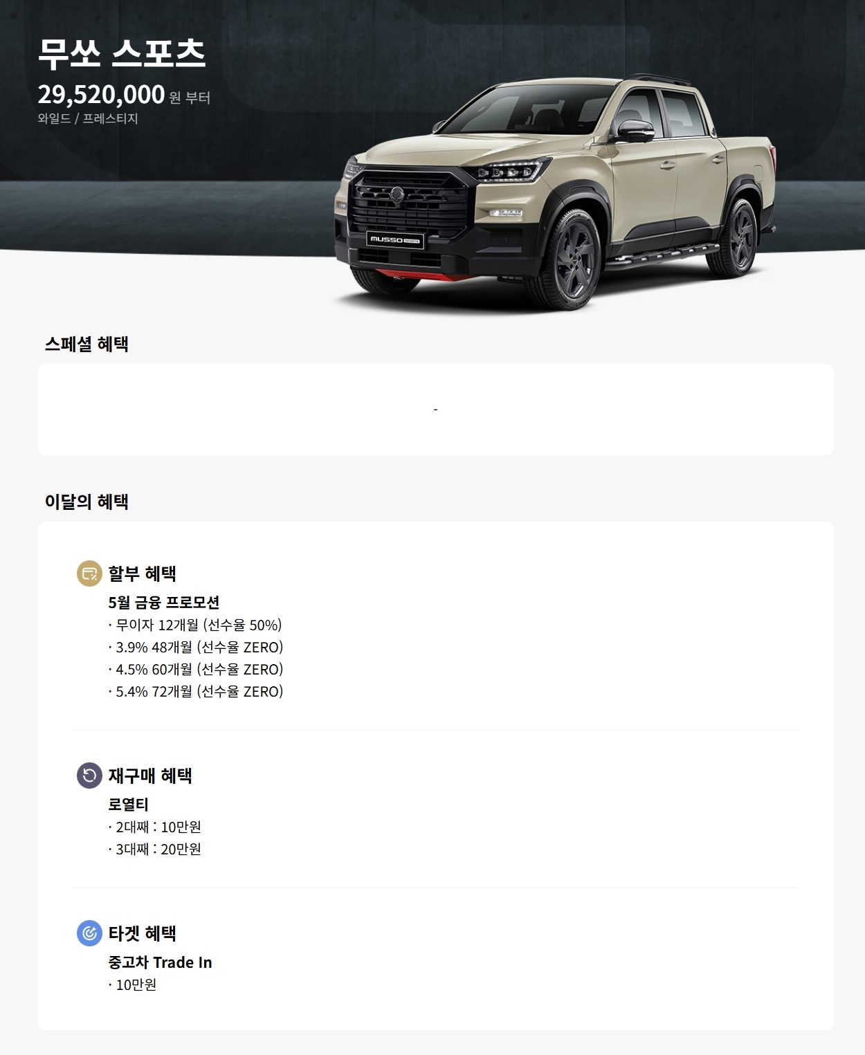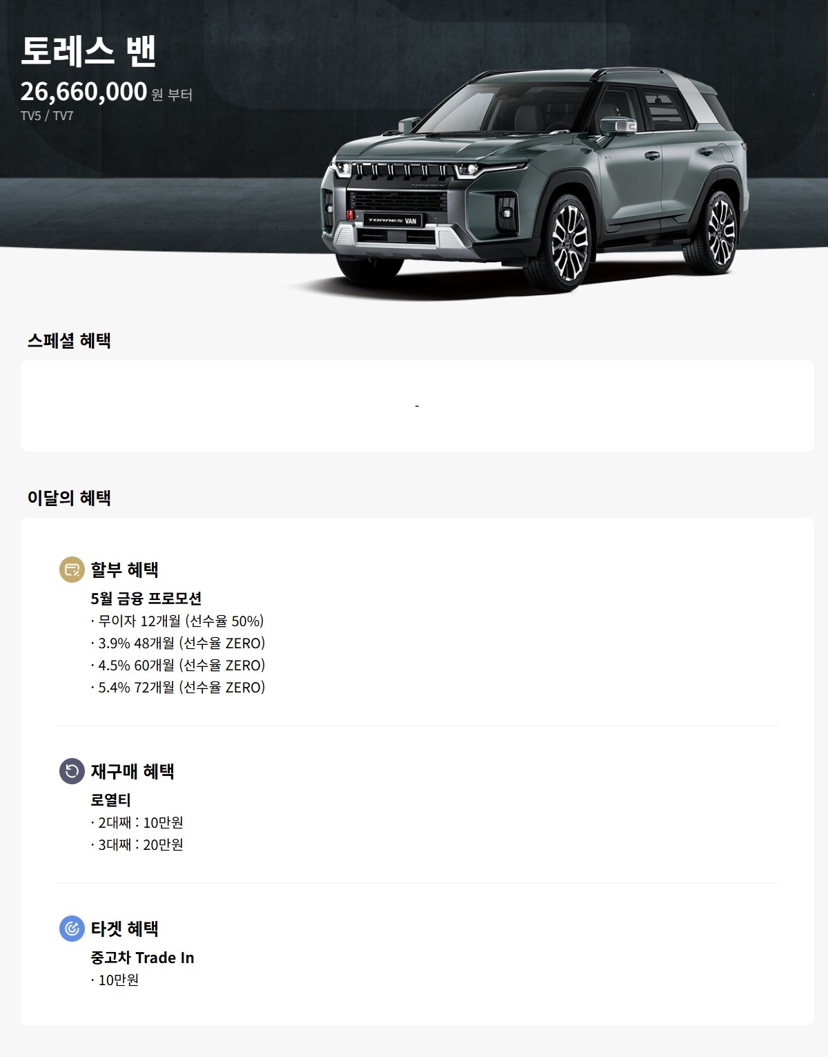 토레스 승용형 모델과 마찬가지로, 이번 5월 프로모션이 완전 삭제되었습니다.