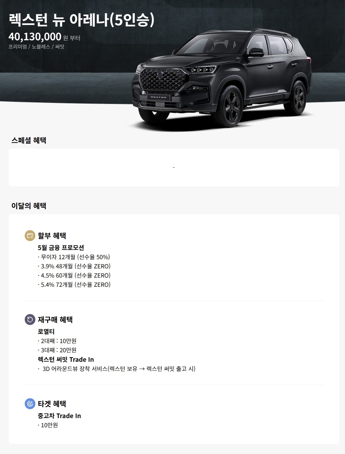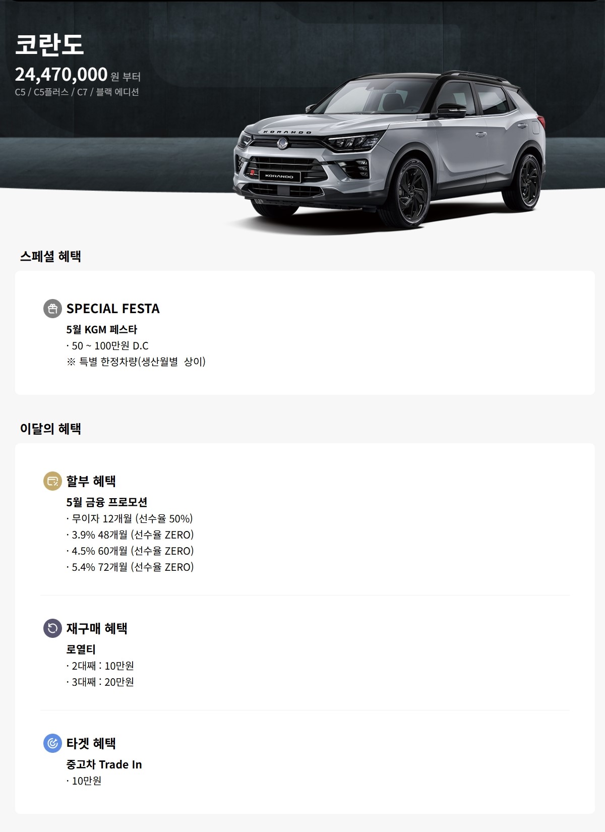 이상하게 이번 5월은 현대기아는 물론이고, 쉐보레나 르노 모두 프로모션이 좋지 않은 달이라, KG모빌리티 프로모션이 어떤지 더욱 궁금하네요!