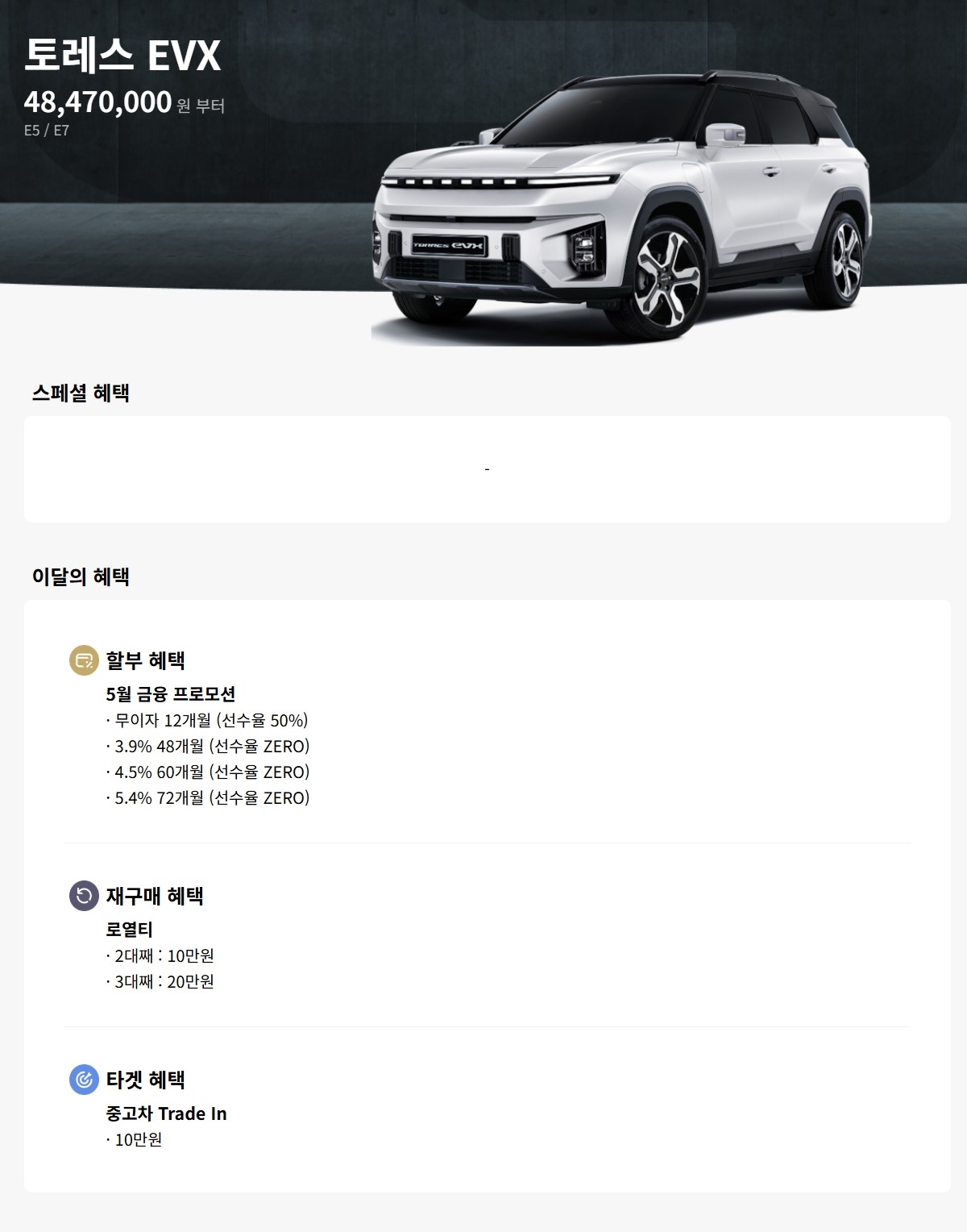 토레스 EVX는 지난달에도 별도 할인이 없었고, 지난달 상품성 개선 모델인 토레스 EVX 알파가 출시하였기에, 필요하신 분께서는 그냥 사셔도 되지 않을까 싶은 차종입니다.