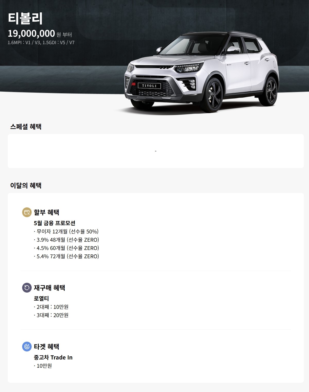 티볼리는 할인이 없어진지 꽤 되었는데, KG모빌리티에서도 티볼리에는 더 이상 큰 기대를 안 하는 게 아닐까 하는 생각입니다.