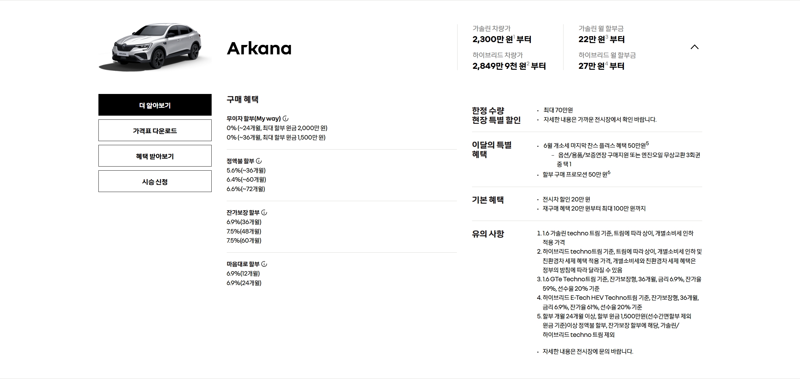 아르카나와 마찬가지로, 한정 수량 특별 할인 70만원 및 6월 플러스 혜택 50만원 등이 있습니다.