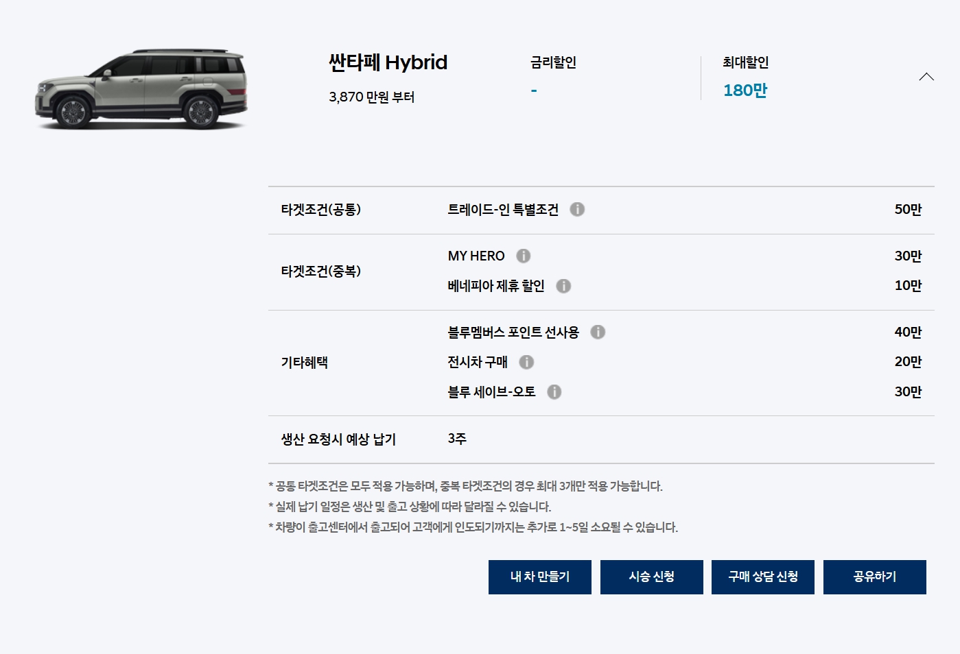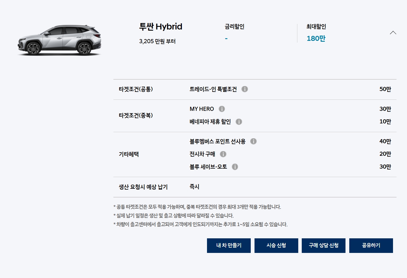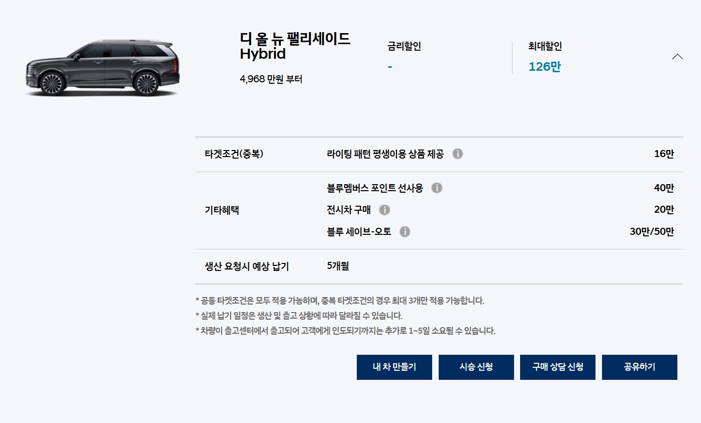 차량들 납기들만 보더라도, 팰리세이드 이 외에 사실상 납기가 긴 차량도 크게 없는 상황이라, 의도적으로 프로모션을 줄이고 있다는 추측이 강하게 듭니다.