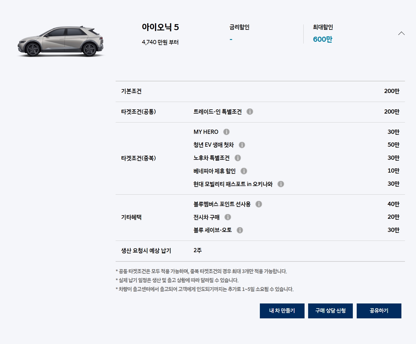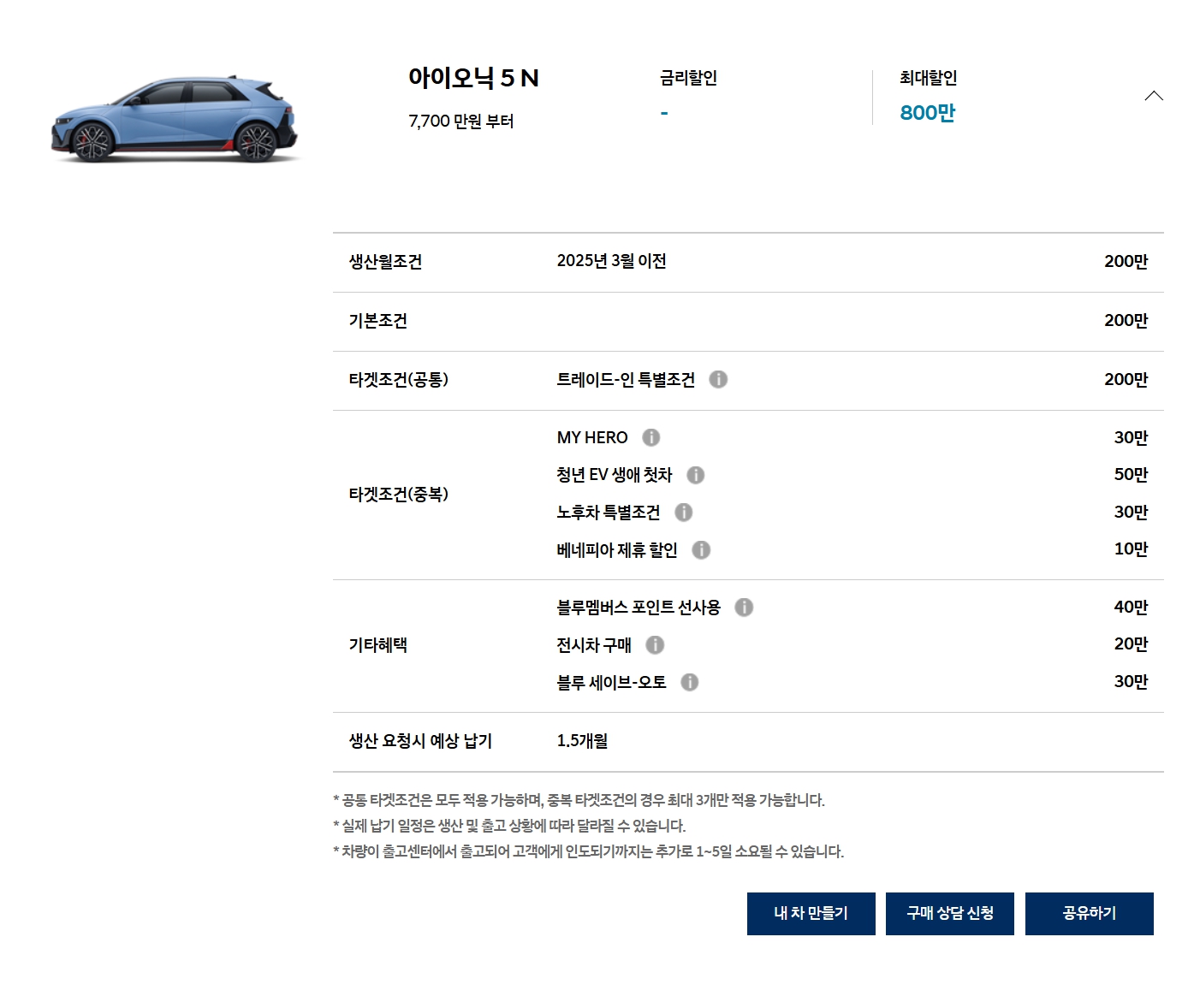 기본조건 200만원 할인이 있고, 아이오닉 5N 모델 한정 재고할인 200만원이 추가됩니다.