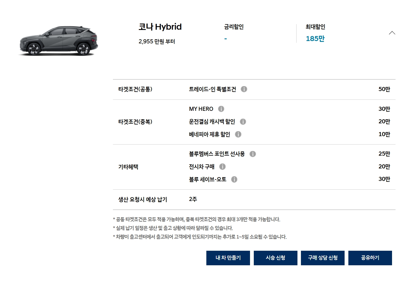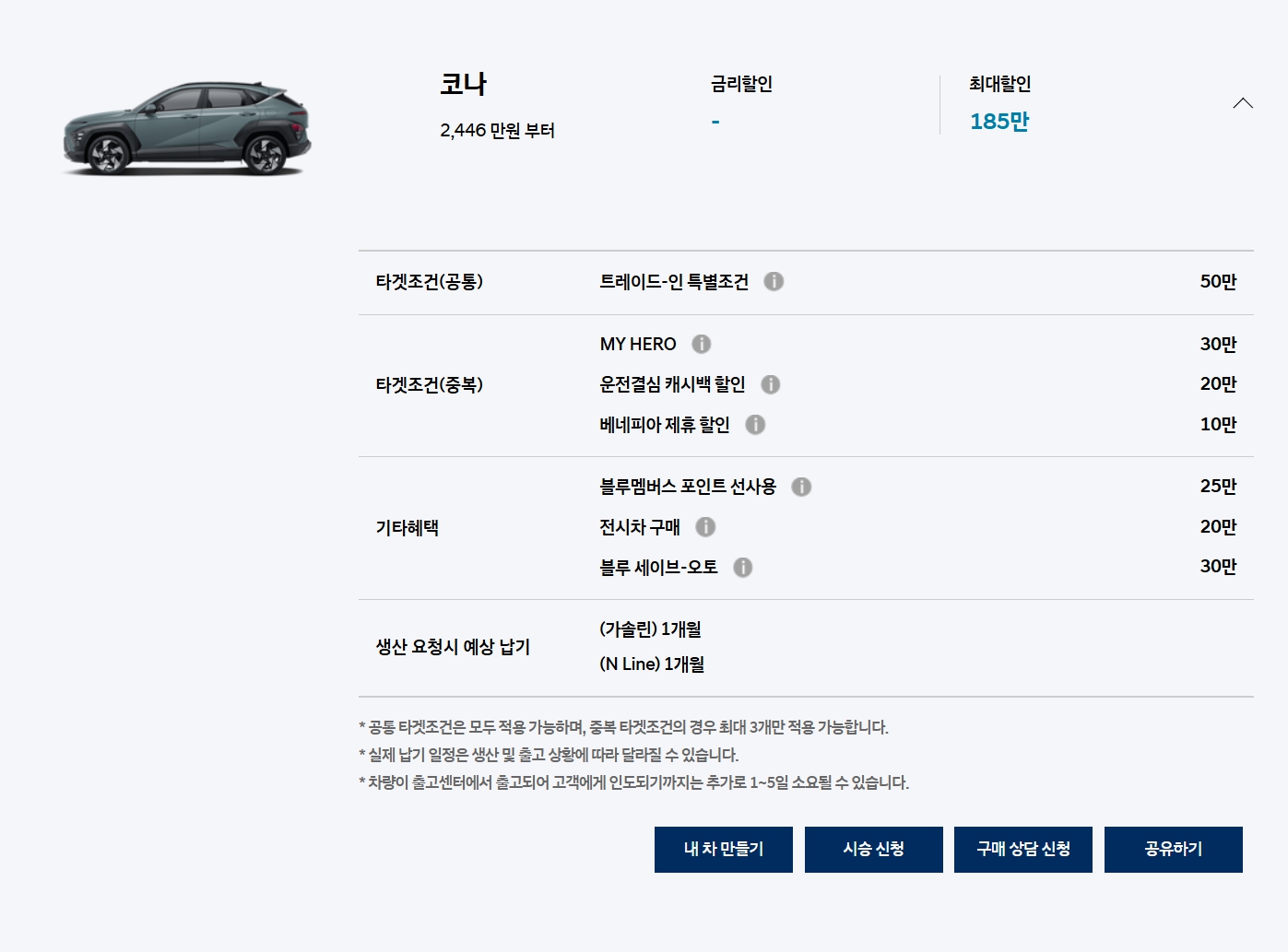 기본이나 재고할인 모두 없으며, 타겟 할인만 있습니다. 쏘나타 및 그랜저와 함께 종종 재고할인을 했던 터라, 아무 할인이 없는 이번 달이 더욱 아쉬운 차종입니다.
