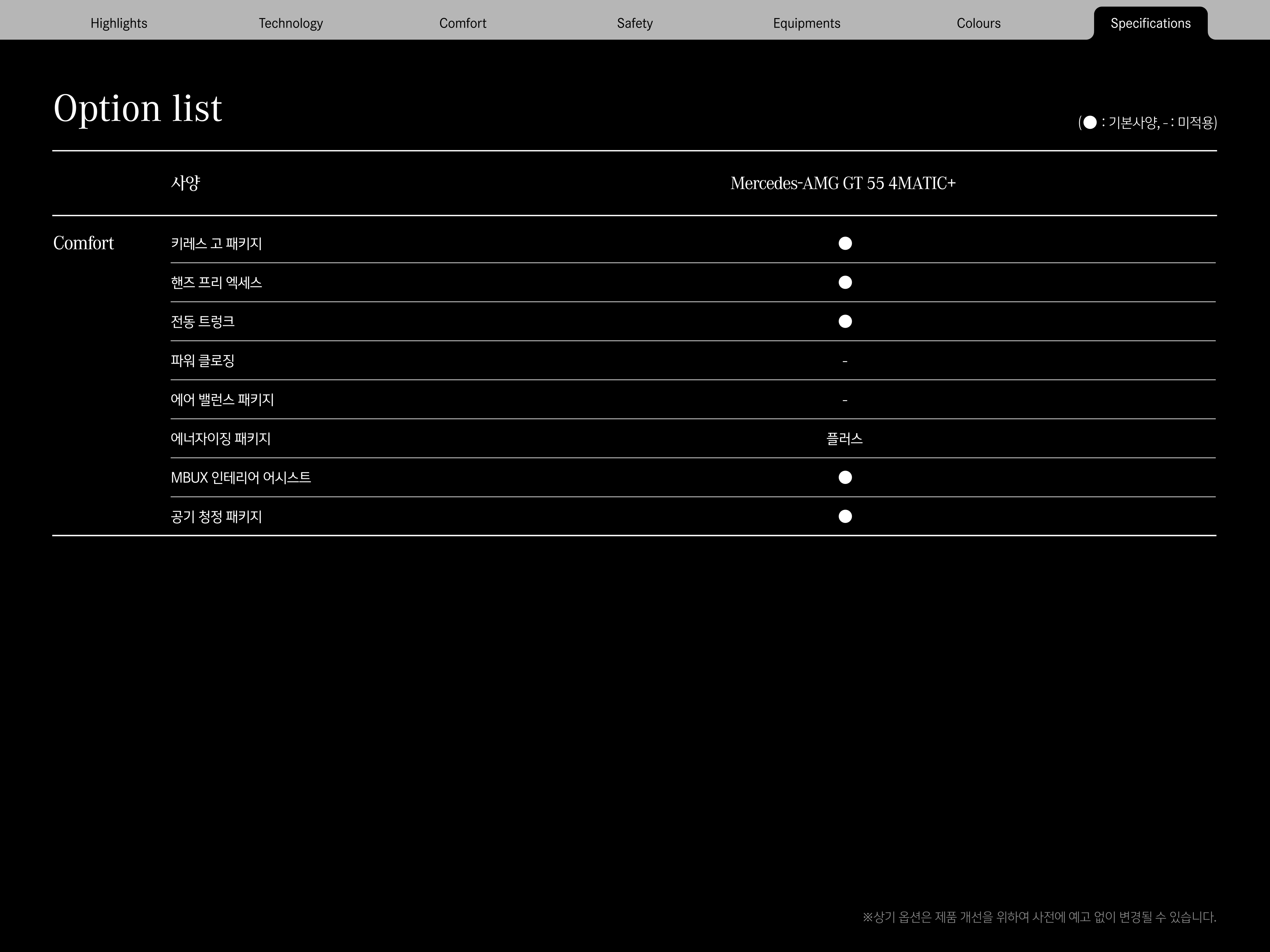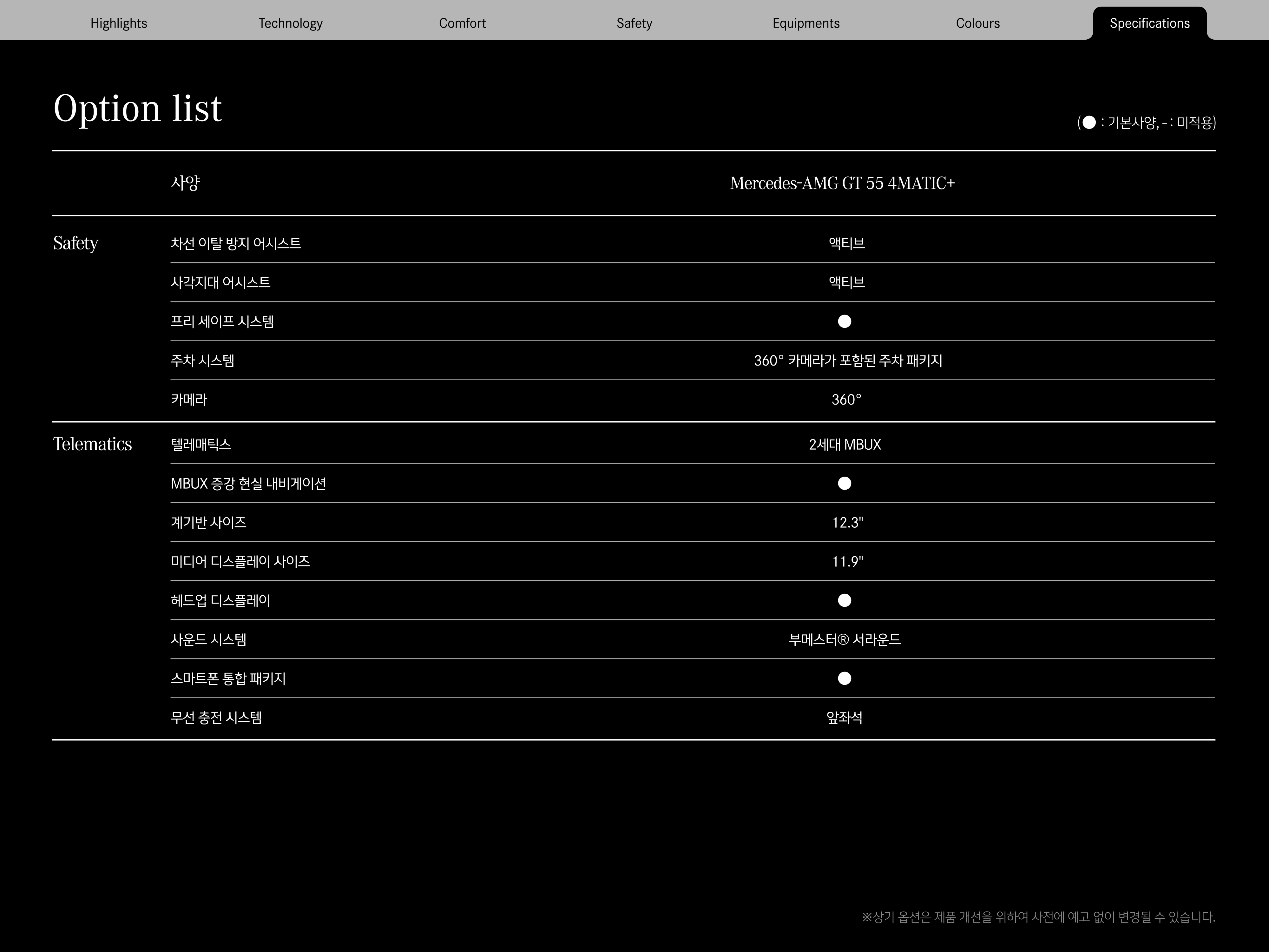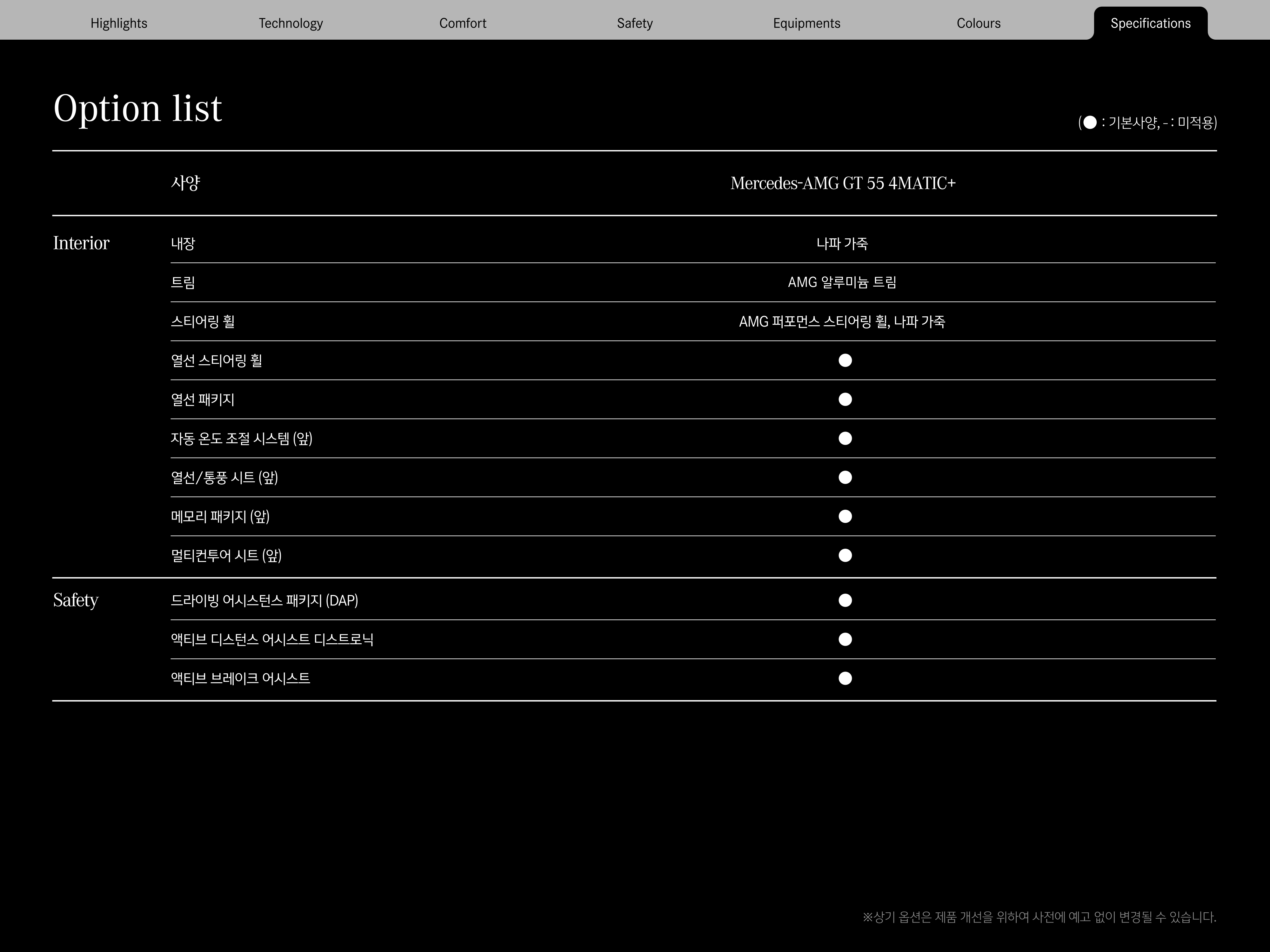 아래는 AMG GT55의 주요 옵션들을 표기한 자료입니다.