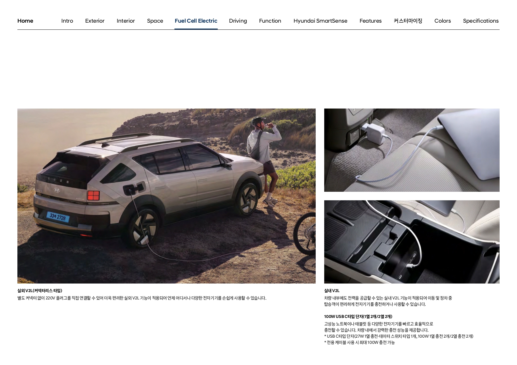 그리고, 내연기관과 같이 수소가 직접 동력원이 되는 건 아니고, 전기를 생산해서 가는 차량이라, 전기차와 마찬가지로 실내/실외 V2L 또한 지원합니다.