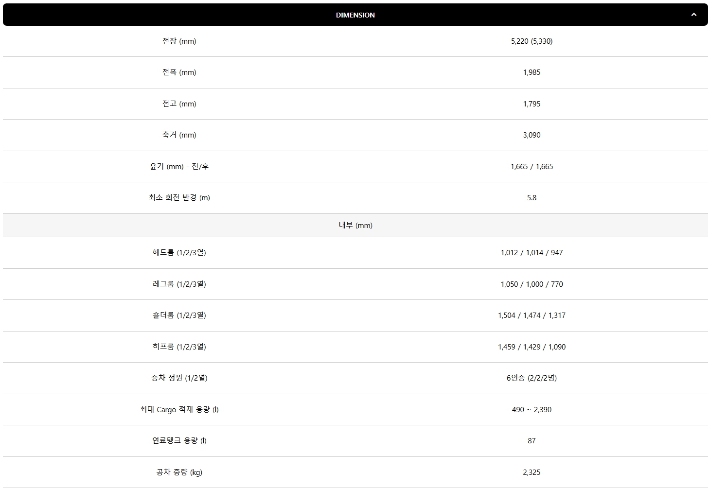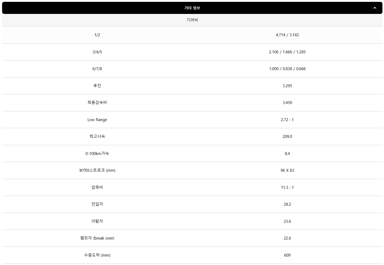 다음은 차량의 크기 및 성능 등을 볼 수 있는 제원 정보입니다.