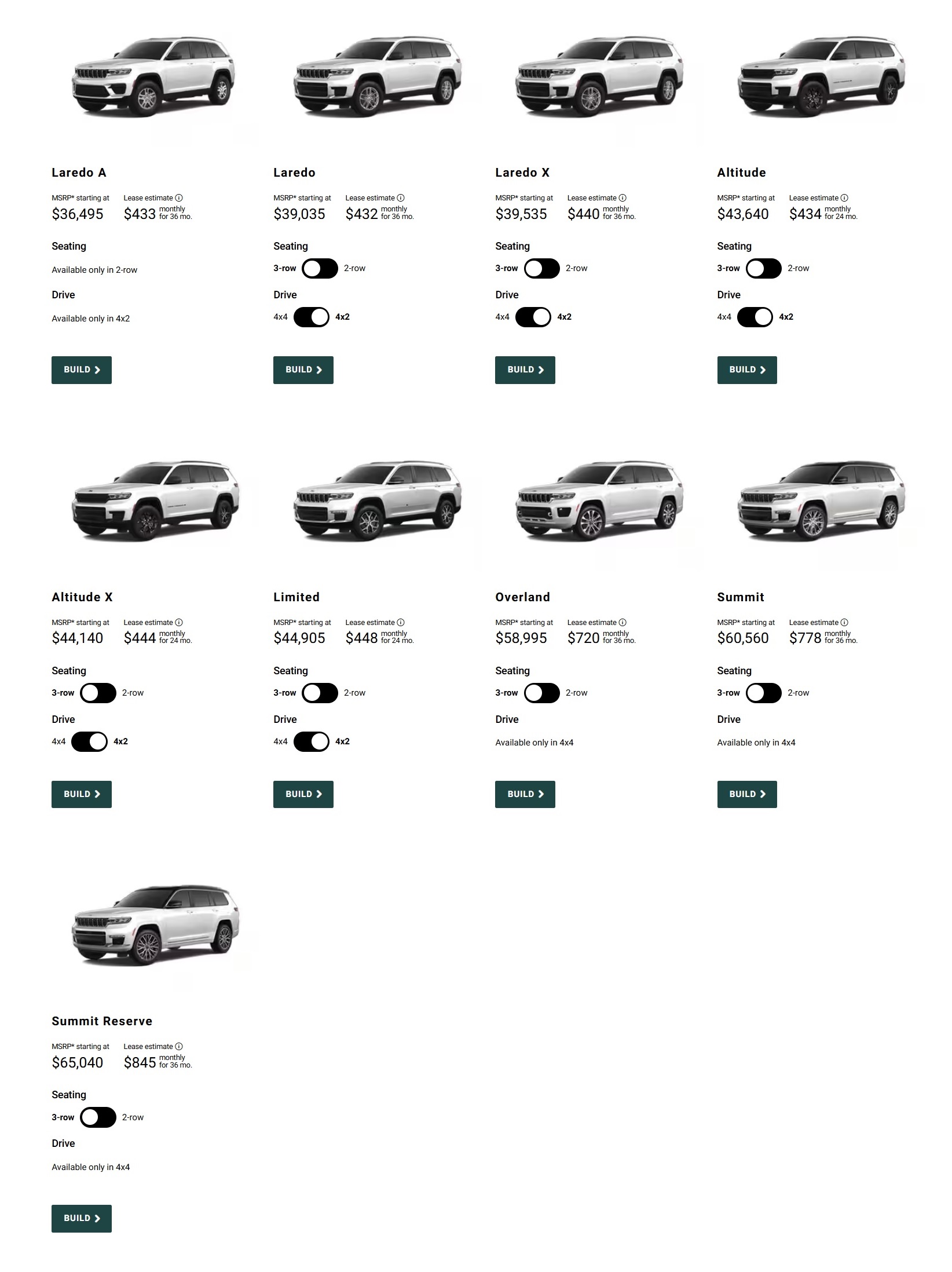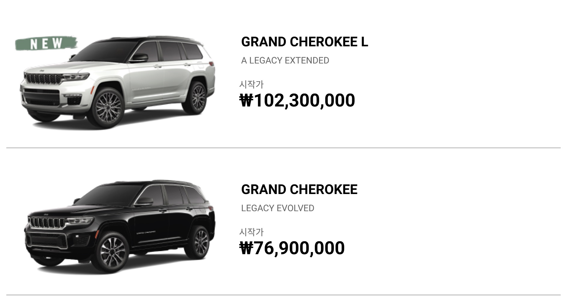 당장 아래 미국 그랜드 체로키L 트림 및 가격 구성만 보아도, 아주 다양하게 있는 것을 확인할 수 있습니다.
