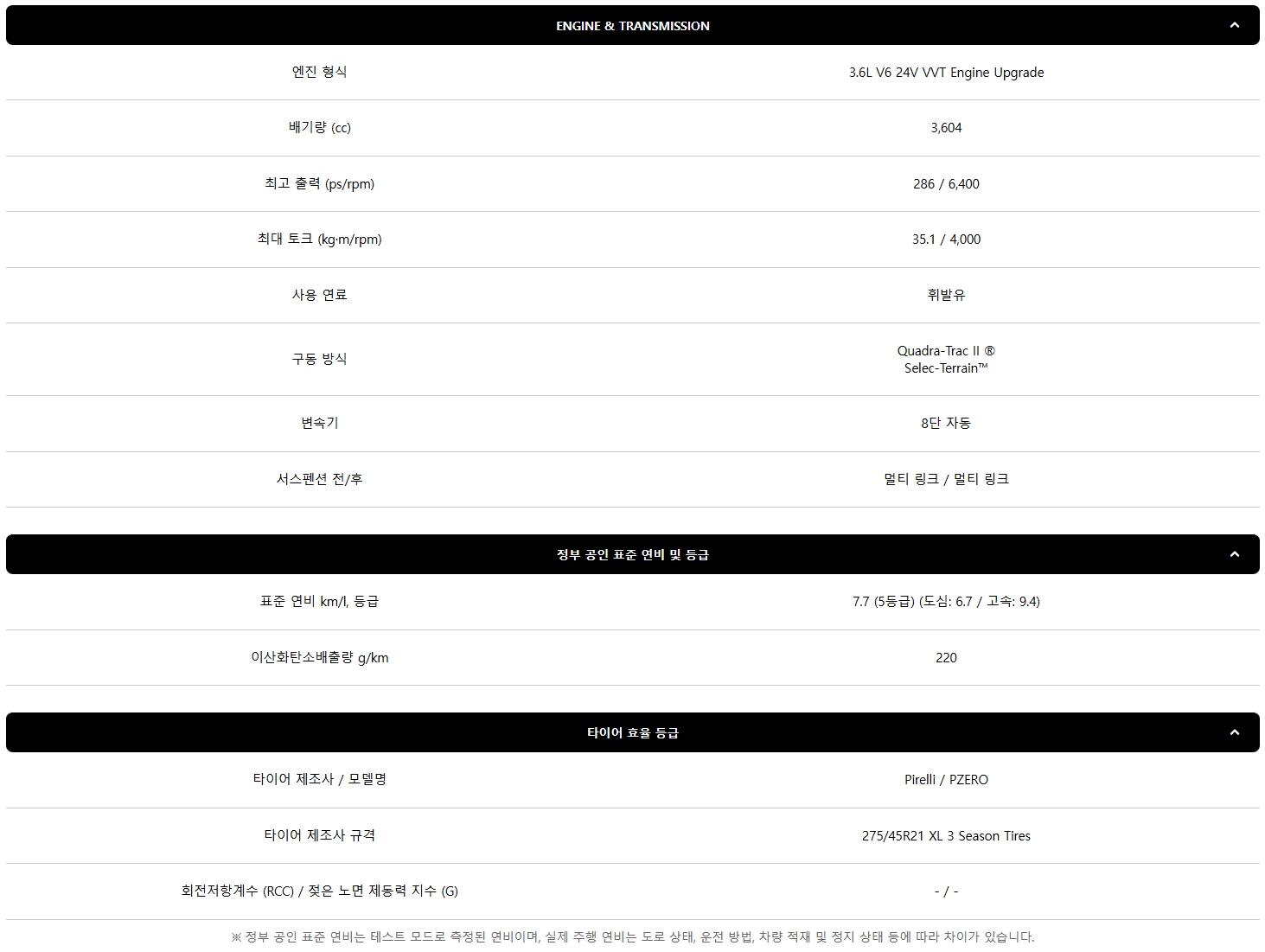 파워트레인은 다소 아쉬운 것이, 요즘 세상에는 조금 어울리지 않는 6기통 3.6L 자연흡기 엔진입니다.