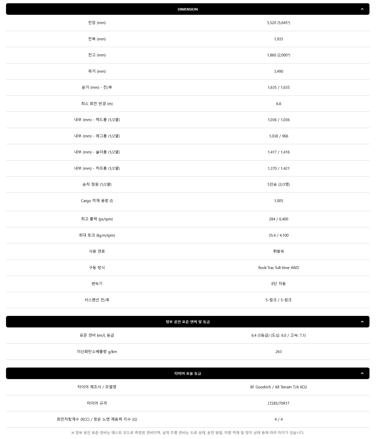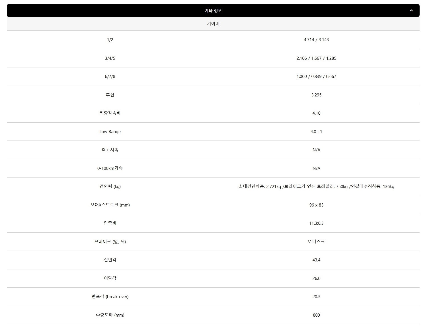 다음은 글래디에이터의 차량 크기나 성능 등을 볼 수 있는 제원입니다.