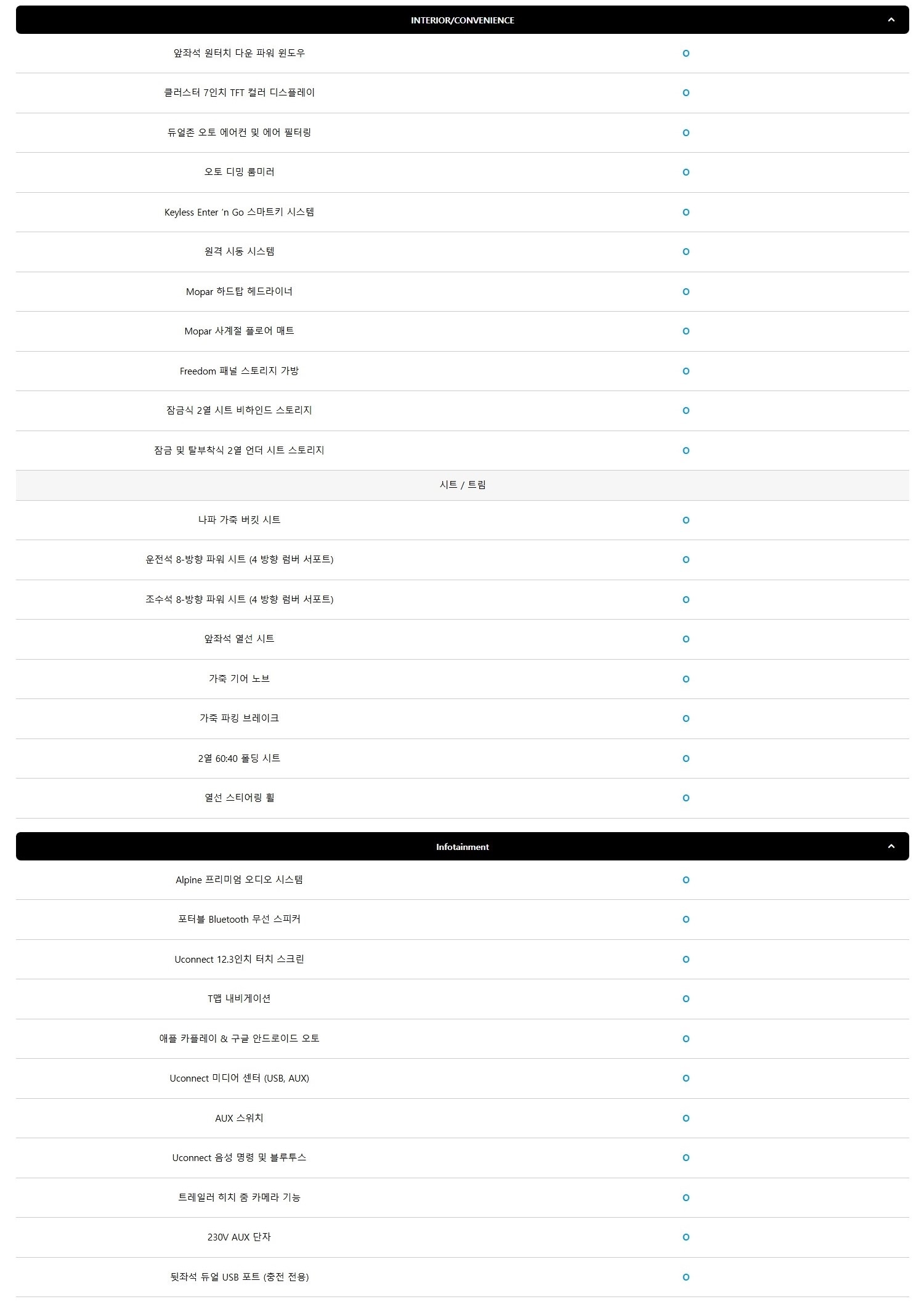앞서 말씀드린 것처럼 국내에는 루비콘 사양만 수입이 되는데, 루비콘 사양 자체가 최상위 트림이라, 기본적으로 옵션은 상당히 좋은 편이라 보시면 됩니다.