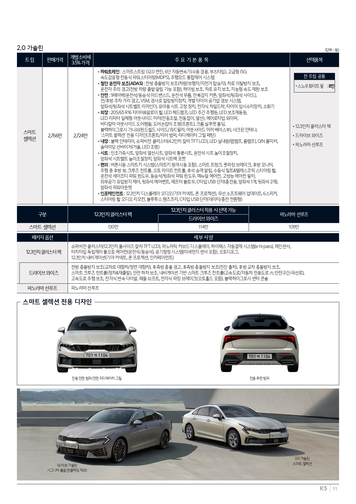 또, 무조건 저렴한 K5를 찾으시는 분들께 맞는 스마트 셀렉션 또한 2.0 가솔린에만 있습니다.