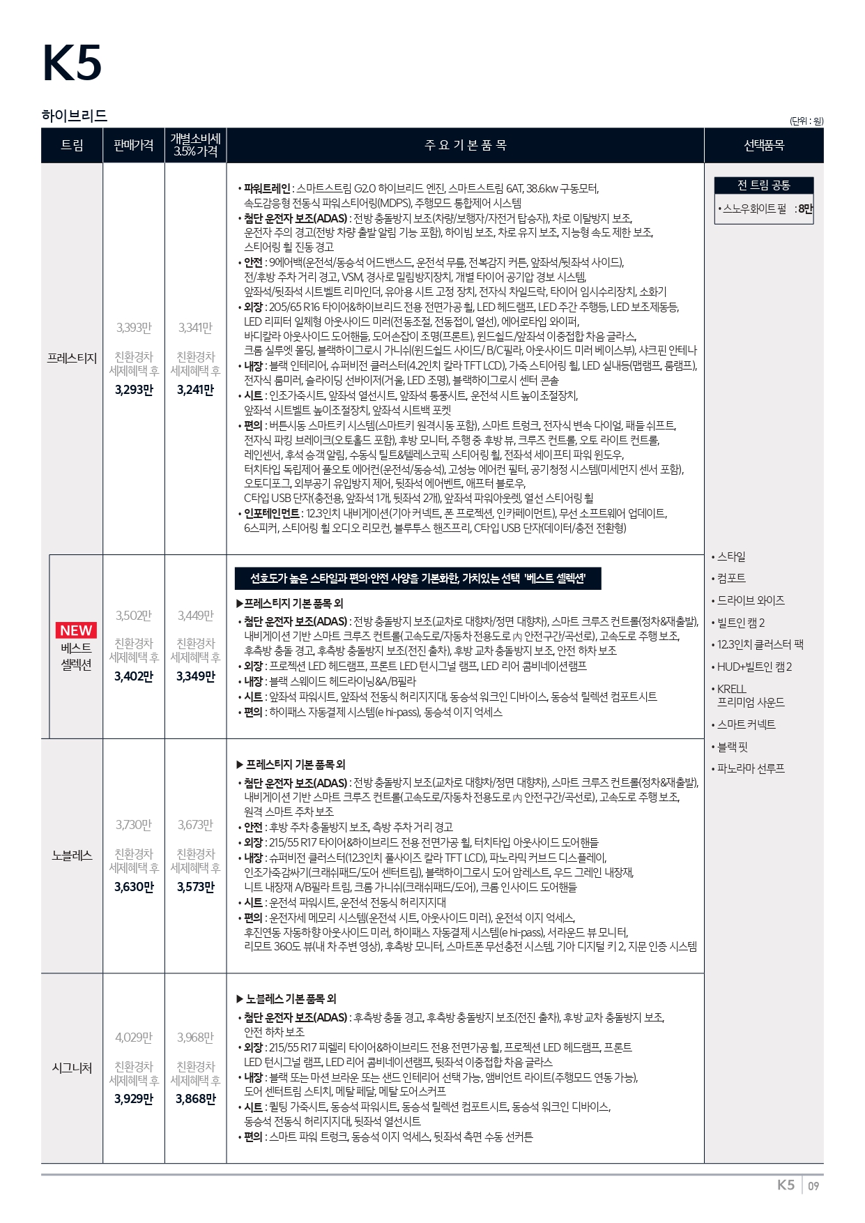▼ 2026 K5 하이브리드 가격표 ▼
