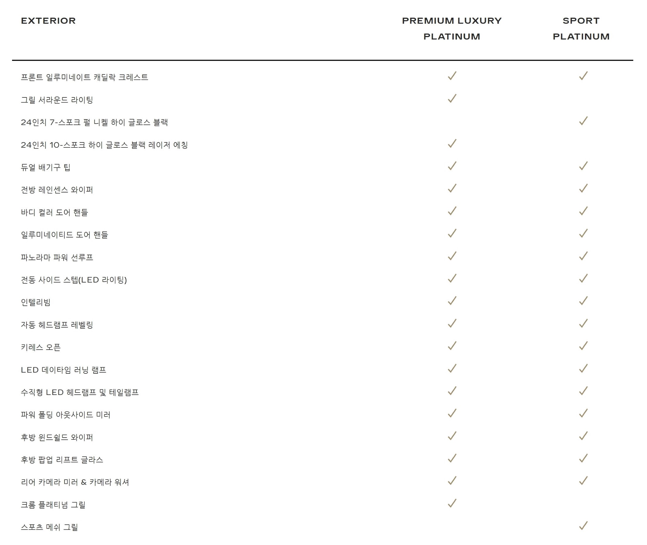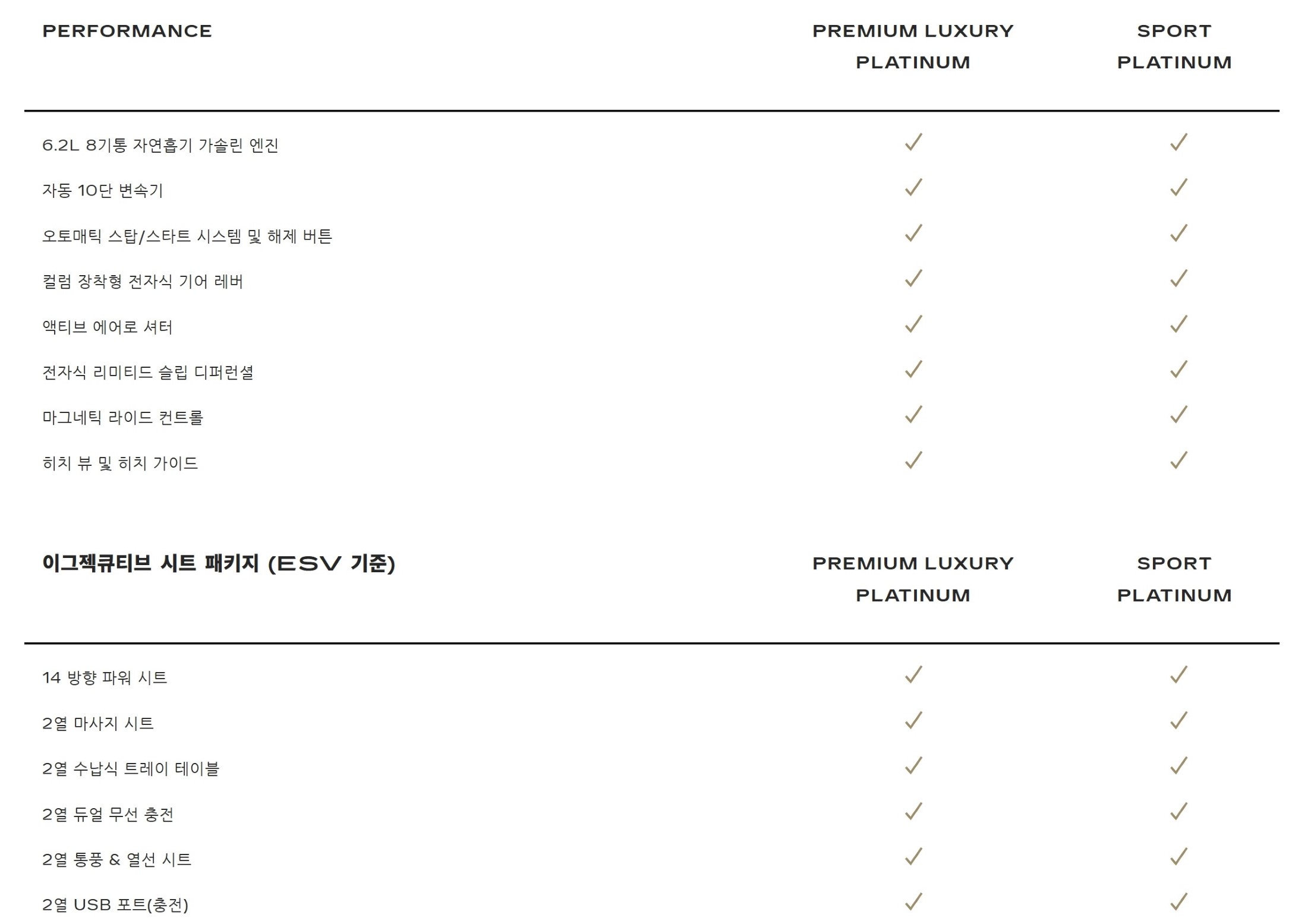 프리미엄 럭셔리 플래티넘 트림과 스포츠 플래티넘 트림 모두 가격이 같기에, 옵션 차이는 디자인적인 요소만 있고, 기능적인 차이는 없습니다.